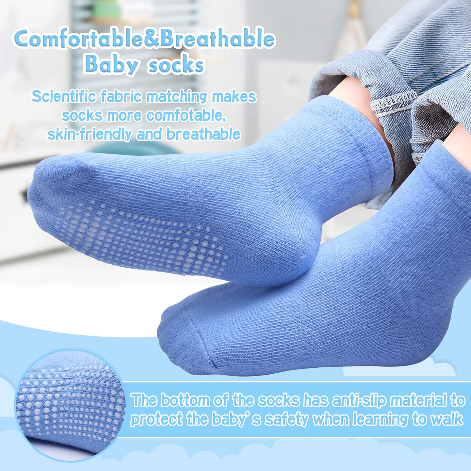 Excessive-quality child anti skid socks are reasonably thick and breathable. Sweat free toes with good safety to child round all of the seasons.