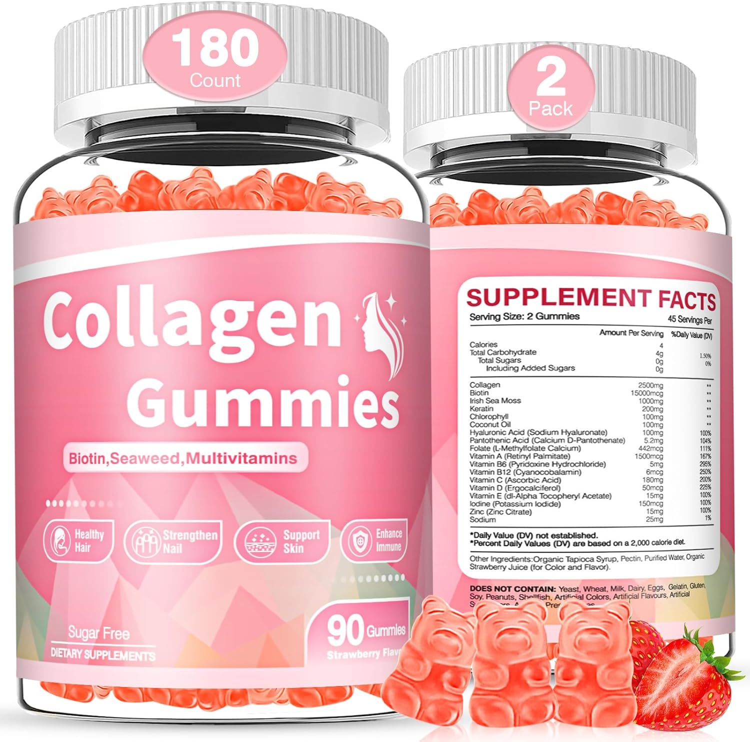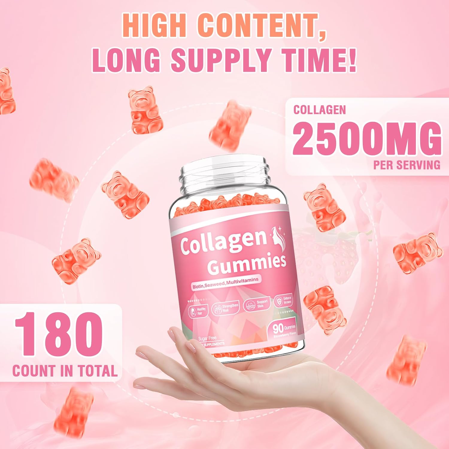 Delicious Taste&Pure Ingredients:Collagen for women gummies not only has strawberry flavor,but is also easy to chew.Collagen chews for women uses Non-GMO and Gluten-Free ingredients.We are also committed to providing high-quality services so that you can use collagen supplements with greater peace of mind.You can also put the collagen gummies in the refrigerator to chill