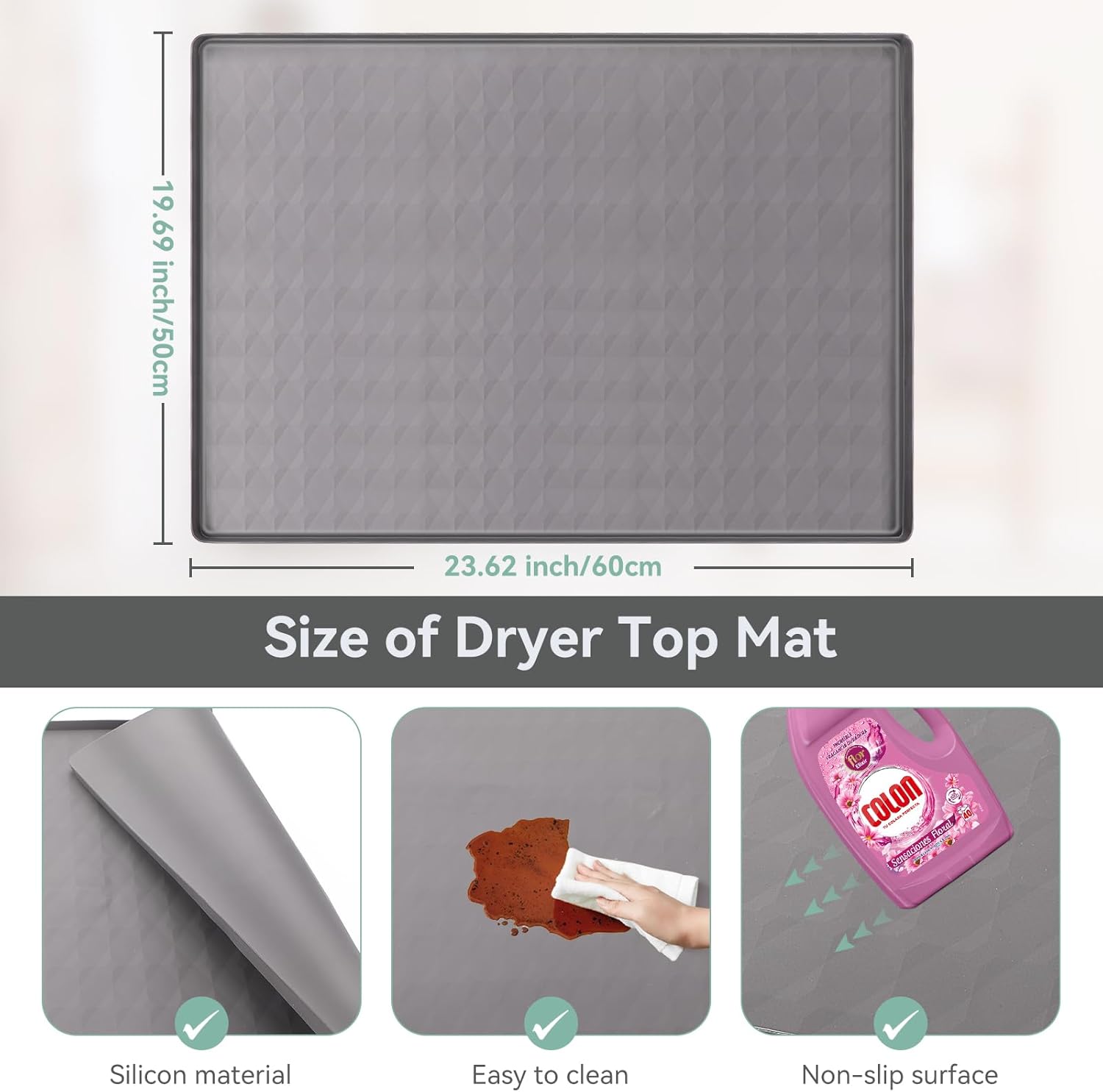 Non-Slip Floor & Sturdy and Secure Development: dryer prime protector mat Measurement at 23.6*19.7 in,That includes a non-slip floor, our washer dryer prime protector prevents your laundry necessities from sliding off throughout use. Garolue silicone laundry guards for washer and dryer is each gentle and versatile. It is not solely waterproof but additionally heat-resistant, guaranteeing it stays intact even in high-temperature circumstances. Relaxation straightforward understanding this washer mat is protected to be used with sizzling dryers,offering complete safety on your laundry home equipment.