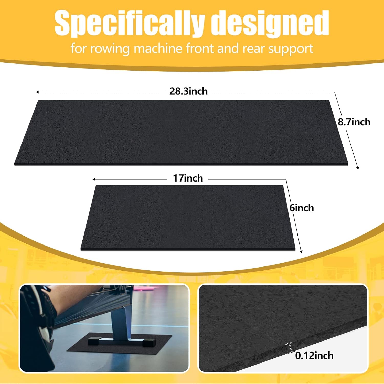 Standard Size: one of the mat is about 28.3 x 8.7 x 0.12 inch, and the other is about 17 x 6 x 0.12 inch, the gym floor mats are suitable enough to fit the front and the back support points of the rowing machine