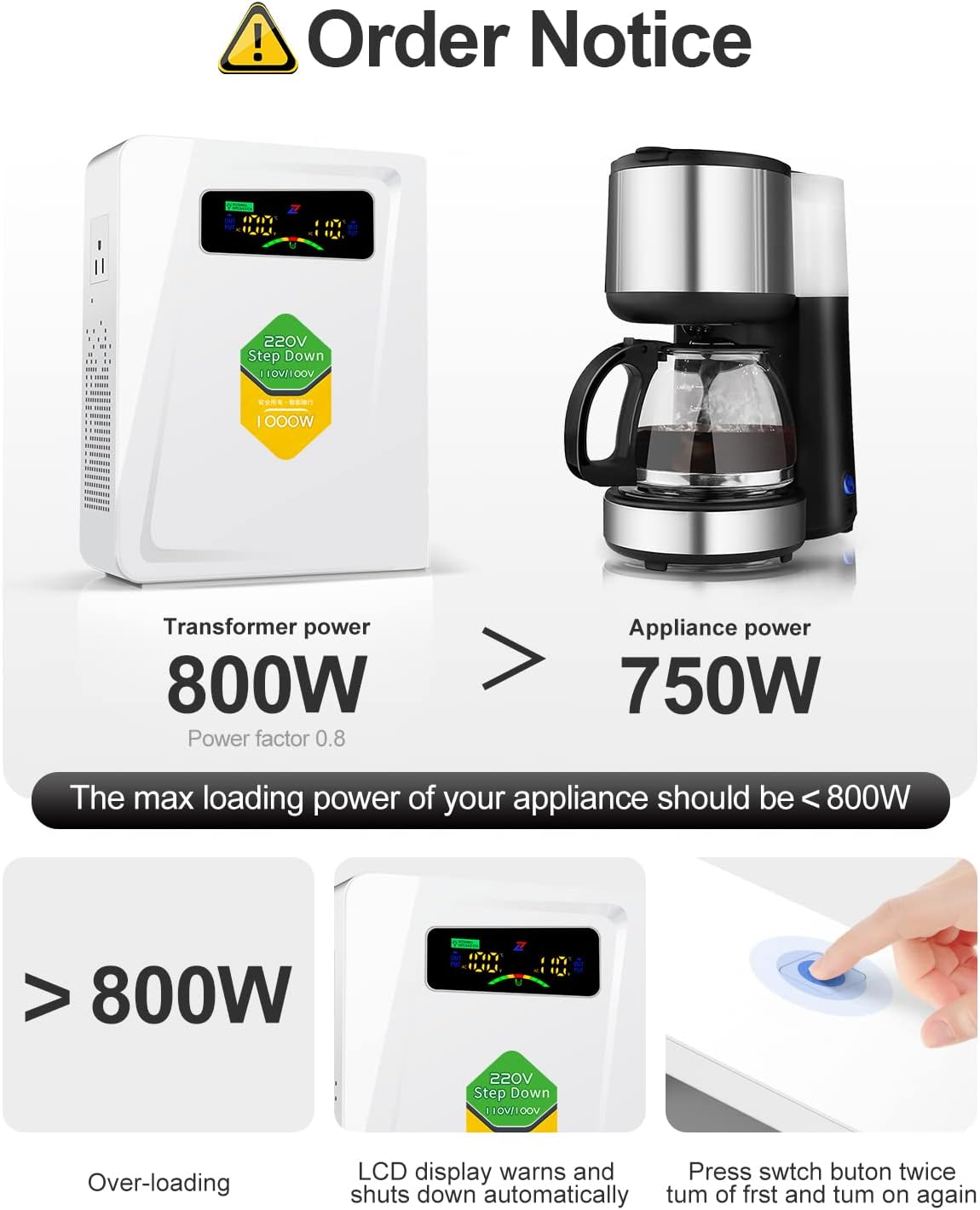 To keep away from pointless returns, please verify the facility of the equipment earlier than buying the transformer.For security causes, it is suggested that home equipment not over 800W be used to forestall injury to the transformer and the home equipment used .