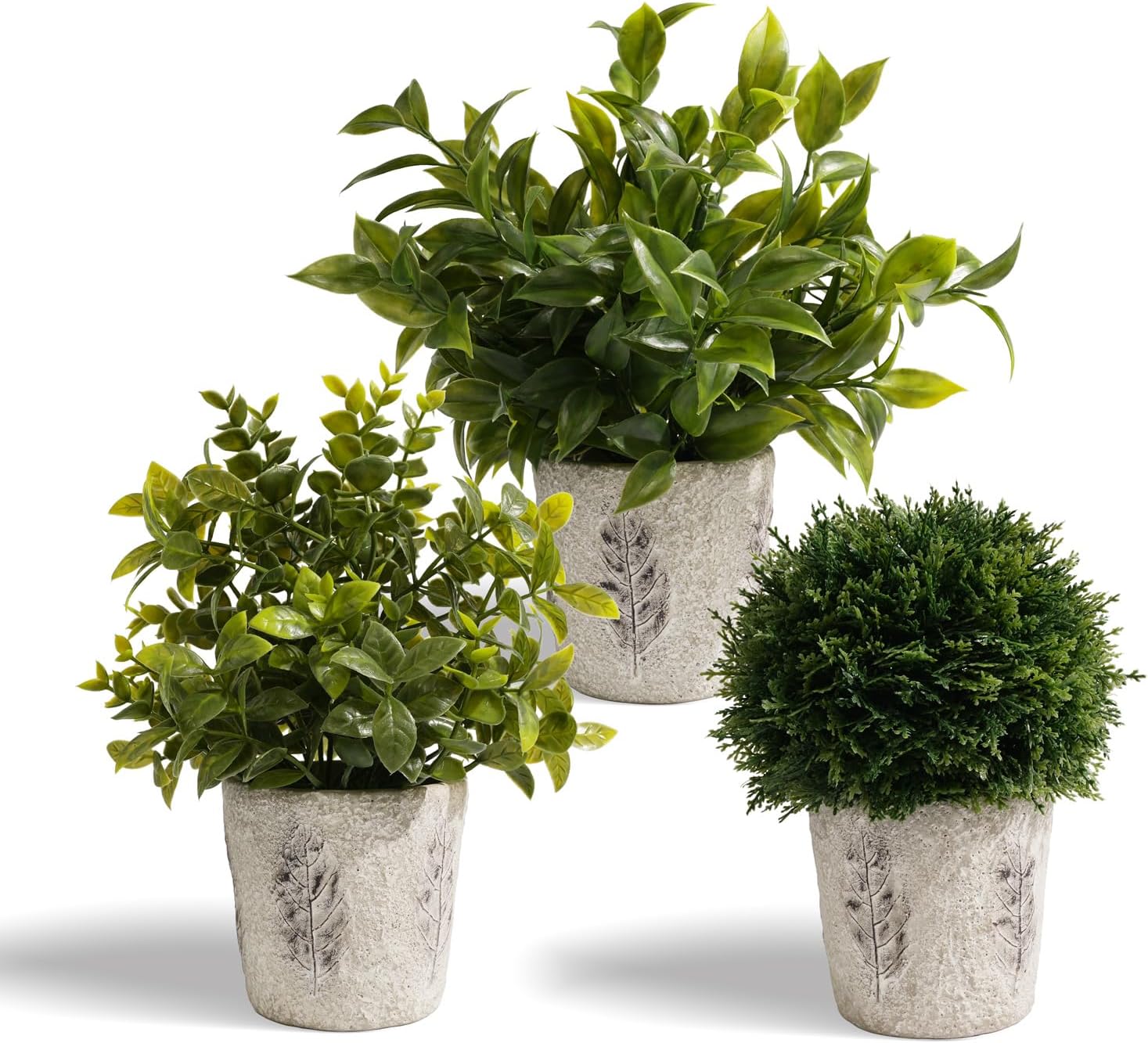 REALISTIC ARTIFICIAL PLANTS IN CEMENT PLANTERS : Three lifelike synthetic vegetation indoor for room decor with textured leaves, set in sturdy concrete pots (11.42/10.83/9.21” tall). Matte-finish planters add rustic-modern model to cabinets, tables, or toilet counters. Maintains vibrant greenery year-round with no watering