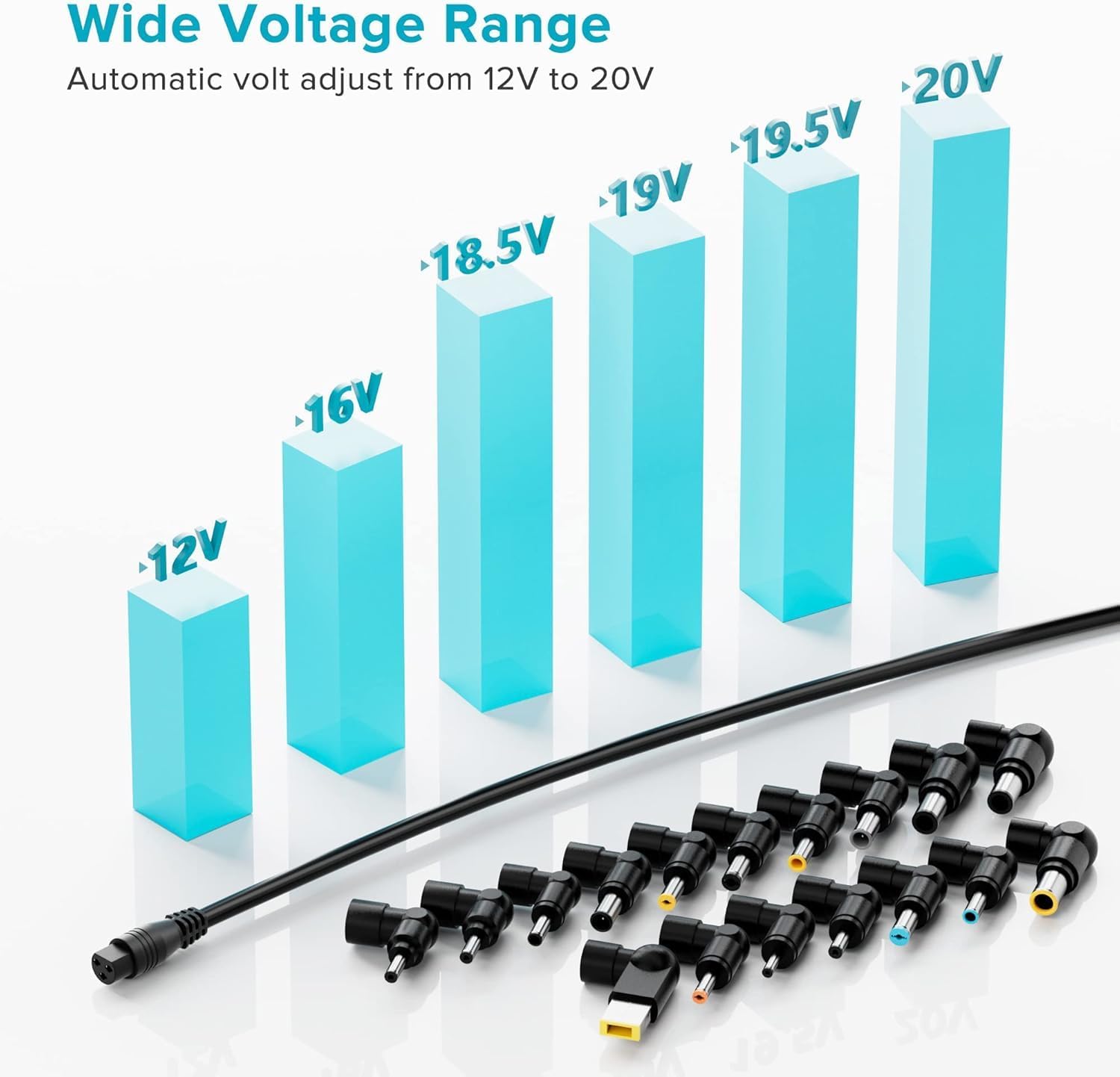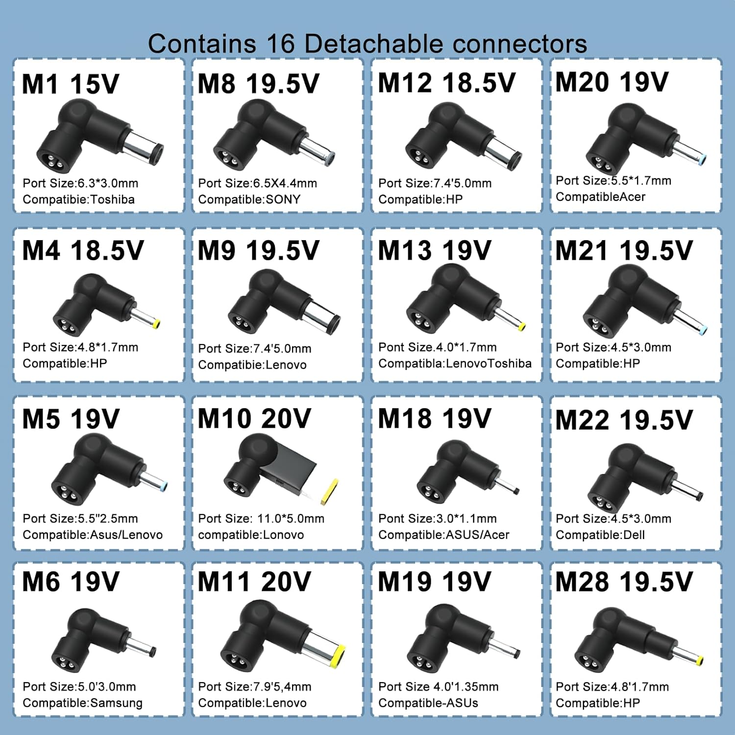 90W Common Laptop computer Charger with 16 DC connector ideas,You possibly can energy your completely different model laptops with only one laptop computer energy twine.Please don’t cost laptops over 90W.