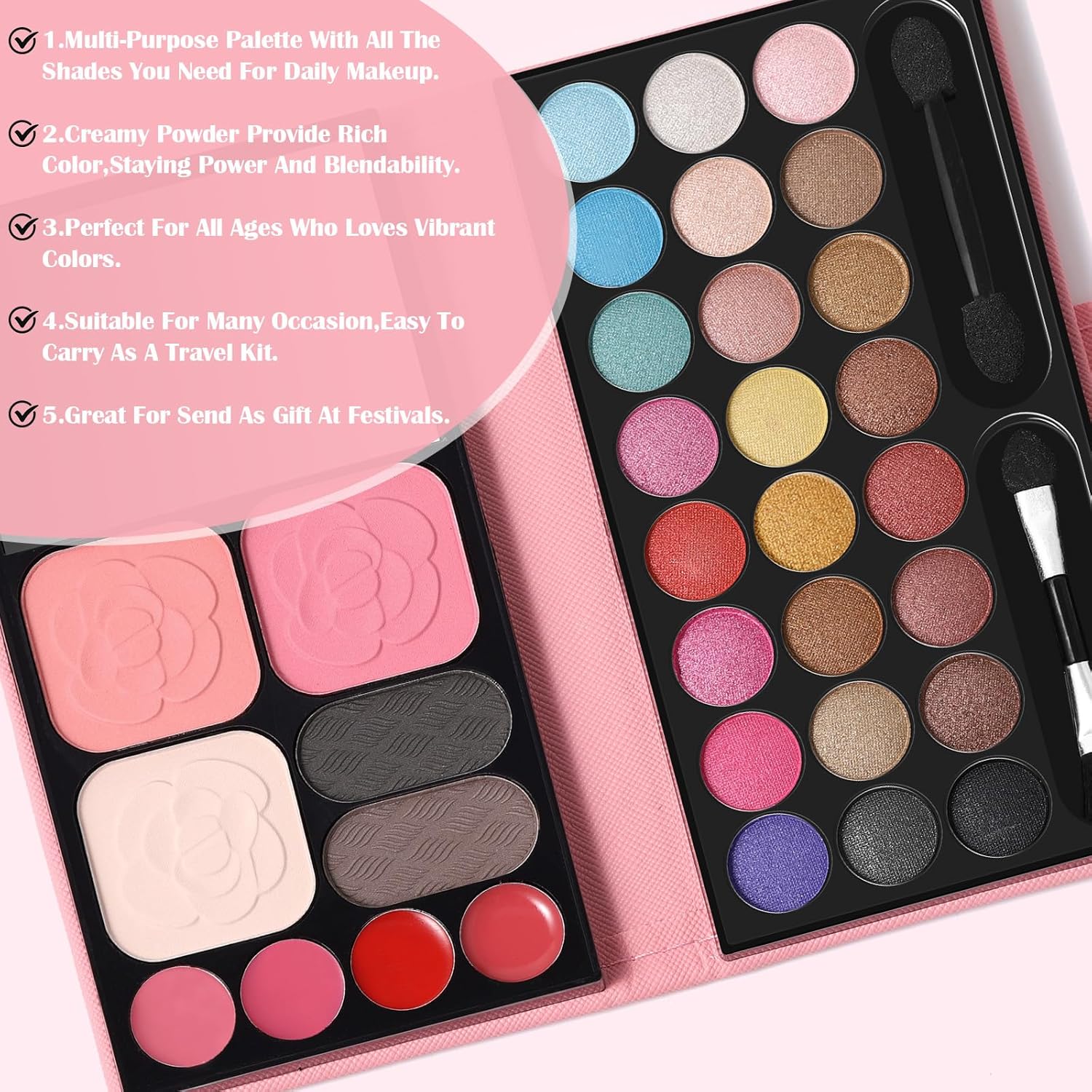 Get every part you want in a single compact case with this all-in-one make-up palette. That includes 24 shimmering eyeshadows, 4 lip shades, 2 blushers, 2 eyebrow powders, 1 pressed powder, a built-in mirror, and a couple of double-ended brushes, it’s designed for full-face make-up anytime, wherever.They supply wealthy colour repay, endurance and blendability. And in addition ship clean metallic and satin end.Skilled pallet present extremely pigmentation and wealthy colours repay however not blooming. All of the shades are straightforward to mix and buildable.Put on your favorite make-up and revel in your enjoyable time with your pals and households!Supreme for a lot of events like pageant, birthday, valentine’s day, Christmas, Thanks giving, mom’s day for your loved ones ,associates or girlfriend, spouse.Good for all ages who loves make-up. Appropriate for events like birthday events, marriage ceremony, theaters, cosplay exhibits, costume, salon, dance performances, engagement social gathering, commencement and so forth. Straightforward to create totally different stunning seems for teenagers and women.
