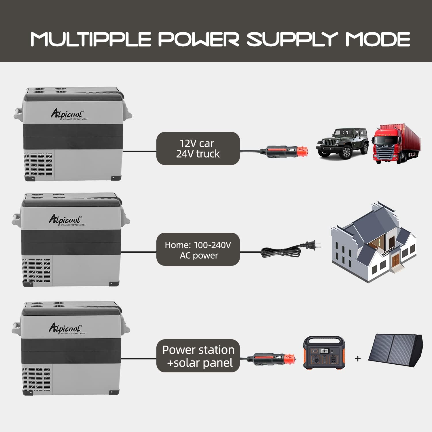 1 X Alpicool fridge freezer1 X DC energy wire(12/24V)1 X AC adapter(110-240V)1 X Instruction e-book