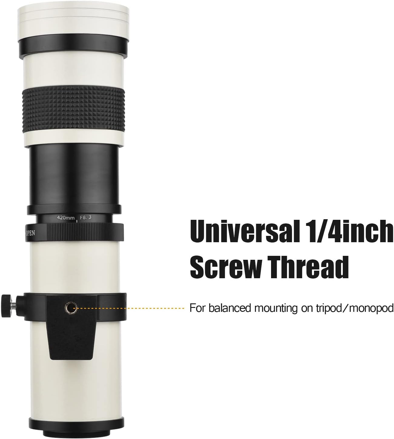 Common 1/4 Mounting: The bottom with 1/4 screw thread down the lens makes large utility on tripod and monopod, the bottom with ring can rotate, handy to put in in seconds.