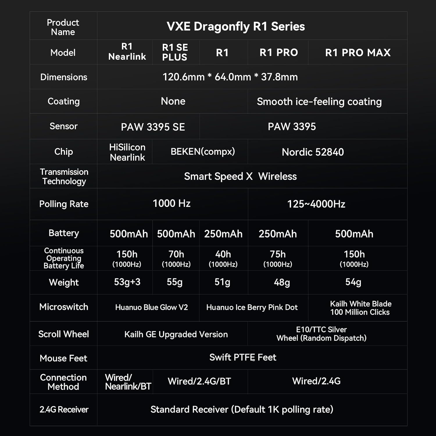 ADJUSTABLE POLLING RATE: R1 SE & R1: 125–2,000Hz; R1 Professional & Professional Max: 125–4,000Hz (4K polling requires separate 4K receiver).