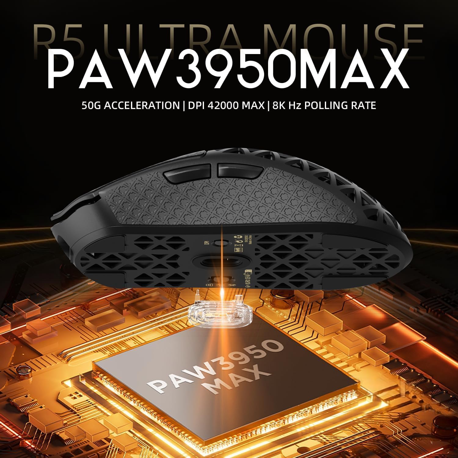 【PAW3950MAX Flagship Sensor: 42K DPI & 0.125ms Response】Dominate aggressive shooters with the PixArt PAW3950 optical engine paired with Nordic 52840 chip: 42,000 DPI precision, 750 IPS monitoring, and 8KHz HyperSpeed wi-fi polling (0.125ms latency vs. commonplace 1ms). Proprietary anti-jitter algorithms obtain ±0.5% monitoring deviation for pixel-perfect headshots in CS2/Valorant and micro-movement management in Apex Legends.