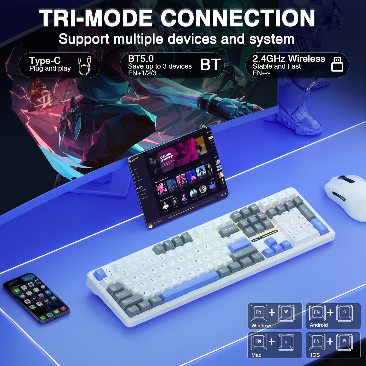 Tri-mode Connection Mechanical Keyboard: The AULA F108 mechanical gaming keyboard helps BT5.0, 2.4GHz wi-fi and USB-C wired connectivity which might save as much as 5 gadgets. The BT5.0 mode permits for fast switching between computer,mac,laptop computer and tablets whereas the two.4GHz wi-fi and USB-C wired mode with a polling fee of 1000Hz ensures extremely aggressive stability and responsiveness. The creamy keyboard with quantity pad is appropriate with Home windows, Mac, IOS and Android working programs, and you may simply swap programs with shortcut keys(Word: In Linux programs, incompatible driver variations might trigger irregular F-zone performance, which is a standard phenomenon. Please relaxation assured to make use of it)