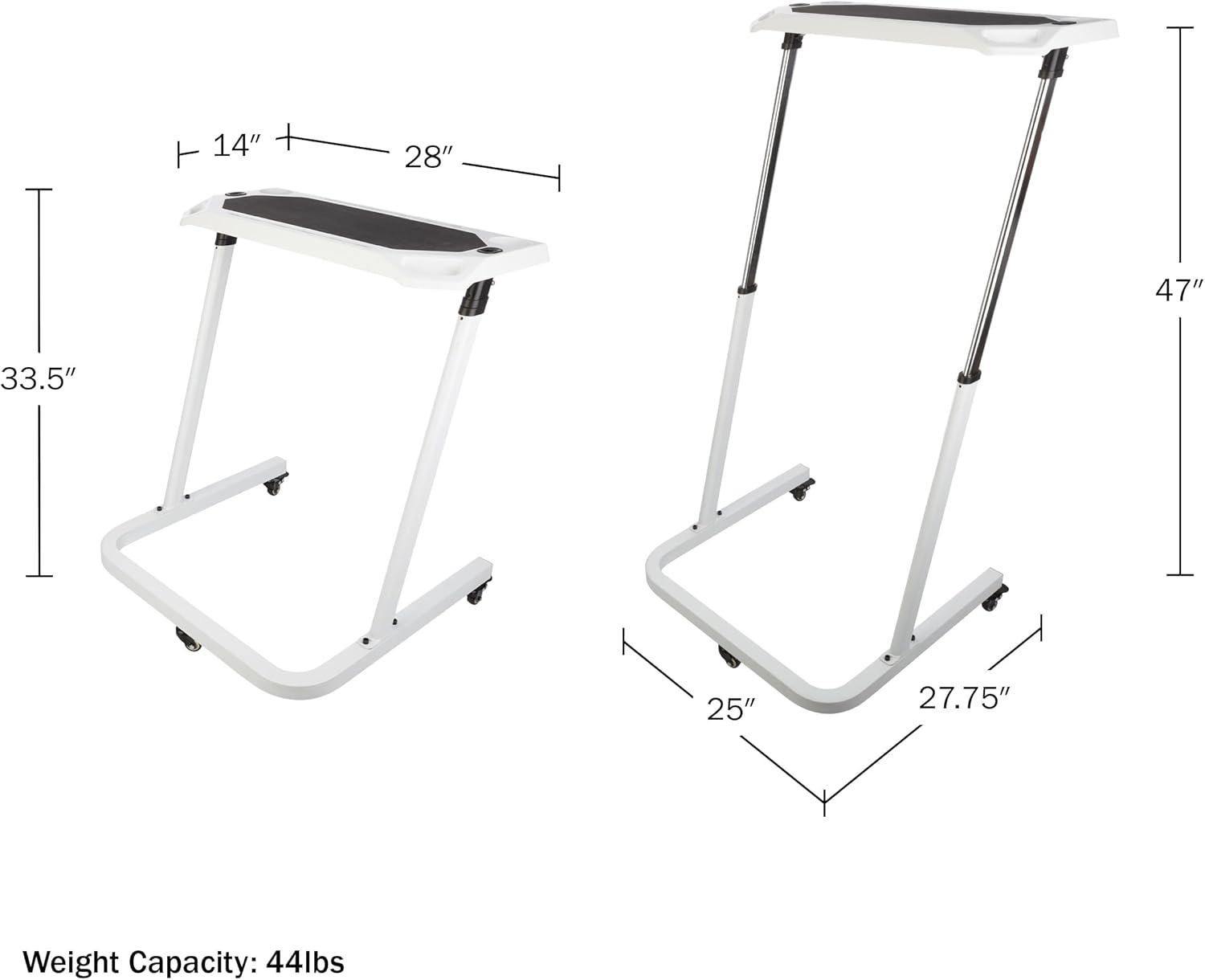 PRODUCT DETAILS – Materials: Metal. Dimensions: (L) 28.25″ x (W) 14.5″ x (H) 33.5″ – 47.5″; Desktop: (L) 28″ x (W) 14″. Stand Up Desk Weight Capability: 48lbs. Colour: White.