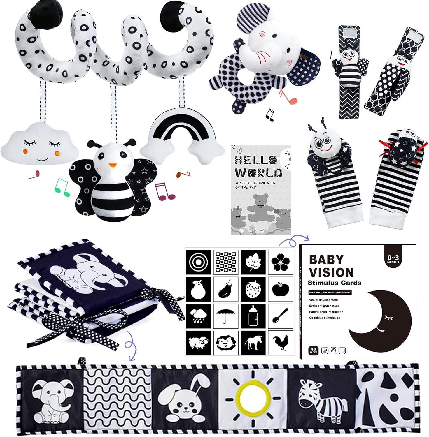 👶🏻💕Enjoyable New child Toys: This wonderful black and white child toy set consists of automobile seat toys, child books, elephant rattle toys, child wrist & sock rattle, black and white playing cards and a cute greeting card. The automobile seat child toy has three hanging components: clouds, bees, and rainbows. When mother and father push the automobile, the toy will make sounds to draw the infant’s consideration and assist the infant develop listening to and imaginative and prescient.