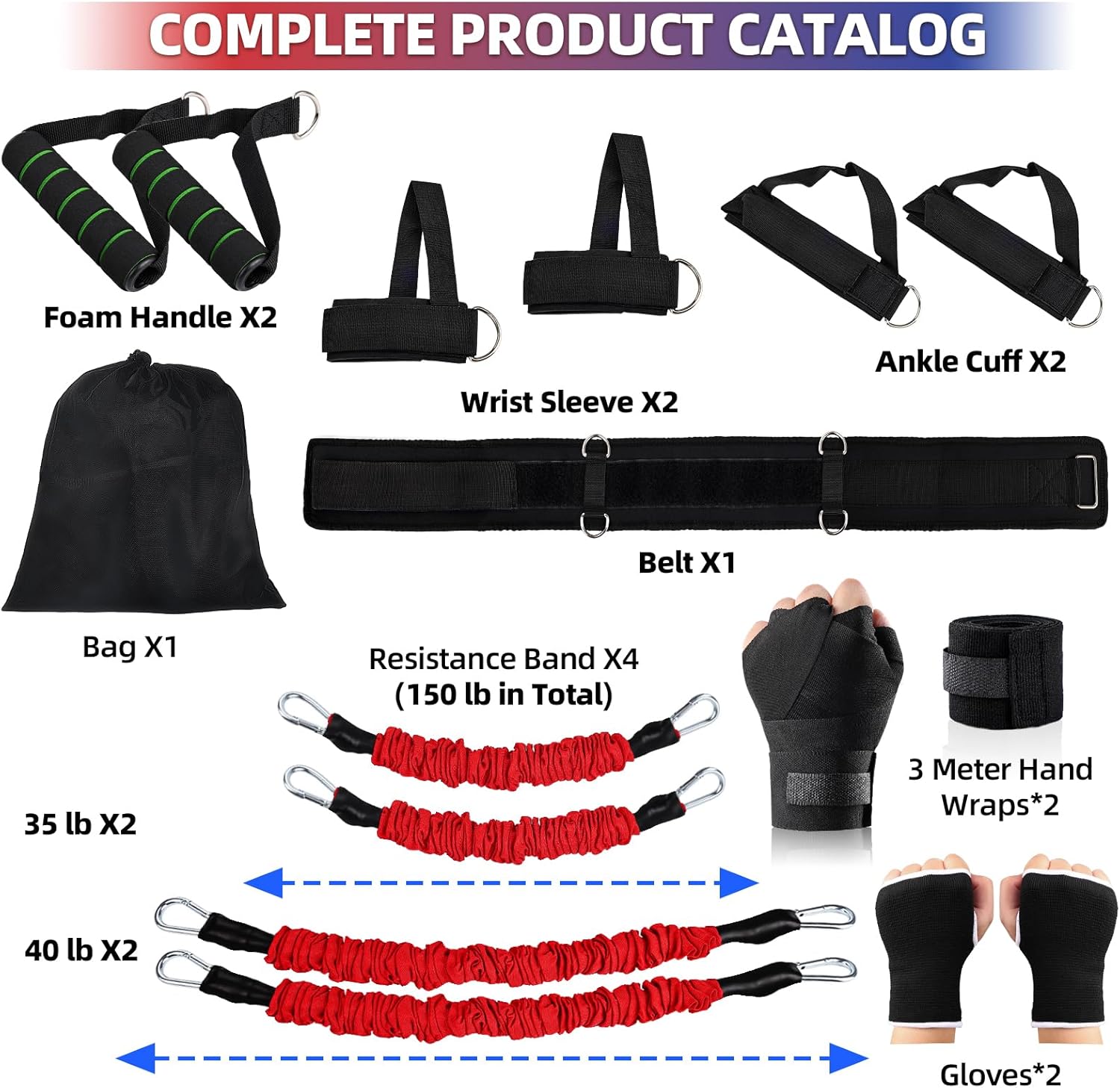 Full Resistance Band Coaching Set: You’ll get 1 adjustable belt, 2 foam handles, 2 wrist sleeves, 2 ankle cuffs, 2 resistance bands of 35 lb and a pair of resistance bands of 40 lb, 2 three meters boxing hand wrap, 2 gloves, and it comes with a wonderfully fitted carry bag for simple carrying and storage.