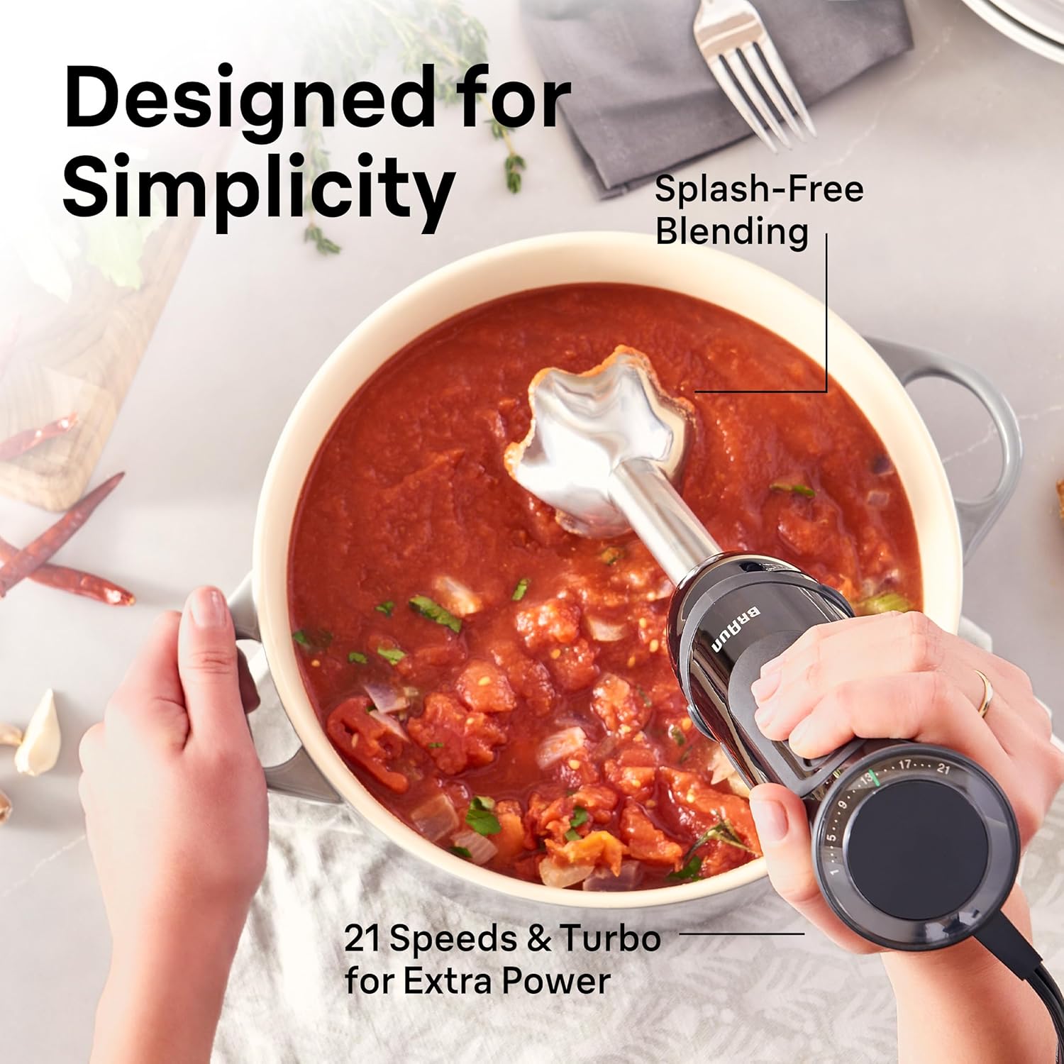 VarioSpeed Know-how One-handed design permits you to simply modify the 21 distinct speeds, with additional TurboBoost pace maximizing potentialities for chopping, chopping and puréeing