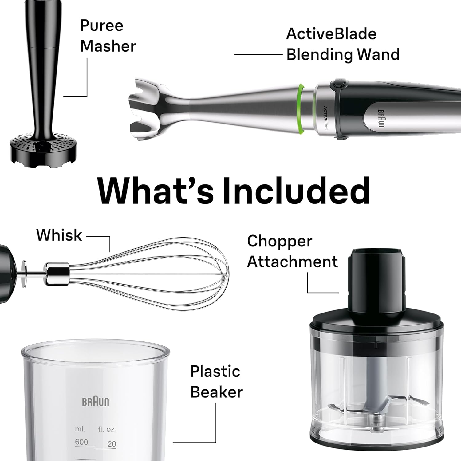 WHAT’S INCLUDED – The MultiQuick 9 comes with a 500 mL chopper, an ice crush knife, a chrome steel whisk, a puree/masher accent, a removable mixing wand, and a 20 oz BPA-free plastic beaker with each mL & fl oz markings.