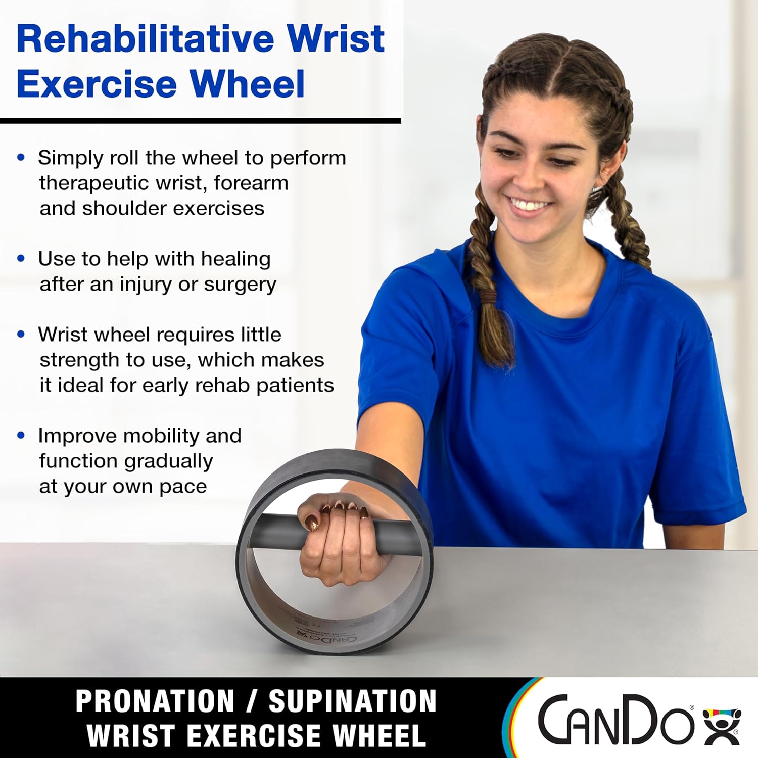 Carry out rehabilitative wrist, forearm, and shoulder workout routines at residence with the CanDo Pronation/Supination Wrist Train Wheel. Our wrist wheel requires little bodily energy to make use of, which makes it a practical rehab coach for sufferers of all ages, and who’re present process early rehab to beat surgical procedure or accidents. The wrist wheel is designed with an easy-to-grip handlebar to accommodate any hand measurement and can be used whereas carrying a flexion glove. The handlebar is positioned off-center to permit for shorter or longer rolling motions. A non-slip rubber floor on the wheel’s exterior permits for clean and steady motions. Our CanDo Pronation/Supination Wrist Train Wheel arrives conveniently prepared to make use of and requires just about no arrange. To make use of, merely grip the wheel with one hand. To carry out pronation workout routines, slowly roll the wheel towards your reverse shoulder and maintain the top place briefly. To carry out supination workout routines, slowly roll the wheel away out of your reverse shoulder and maintain the place briefly. Our wrist wheel is utilized in bodily remedy and occupational remedy clinics to help sufferers recovering from accidents and surgical procedure. Physicians use the upper-extremity rehab assist to information sufferers by way of repetitive, practical actions. CanDo Pronation/Supination Wrist Train Wheel measures 7″ in diameter and weighs slightly below 1 lbs. Its handy measurement makes it straightforward to pack and produce wherever. Use the wheel to carry out rehab workout routines at residence, work or on the go.