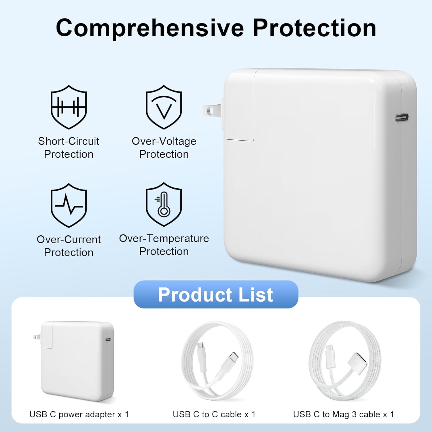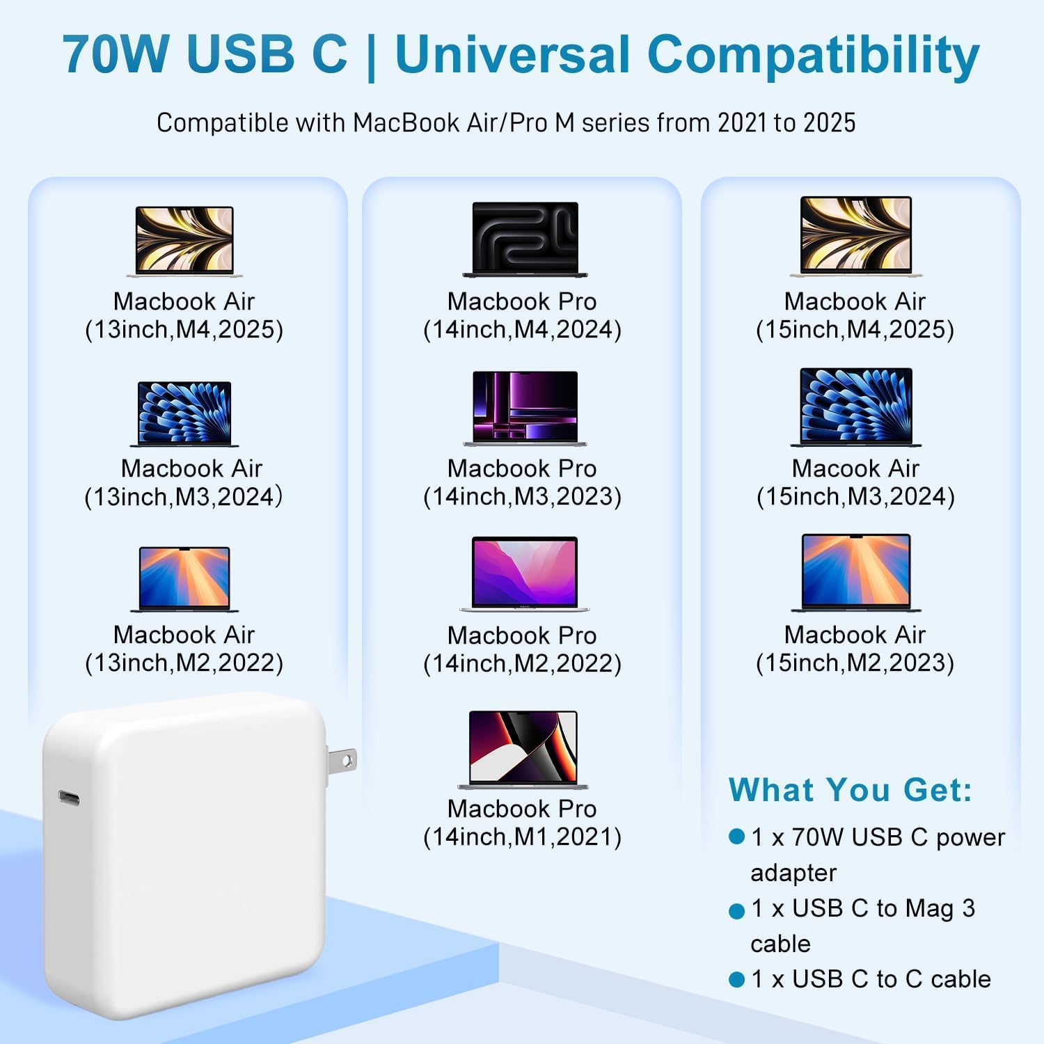 Premium High quality and Supplies:Our 70W charger options superior software program and {hardware} techniques that intelligently adapt to your day by day charging routine, decreasing battery put on and increasing battery life by as much as two instances. It consists of top-rated digital parts and wonderful manufacturing know-how, together with built-in safeguards and a cooling system to stop overcharging, short-circuiting, overheating, and sparks.The charger constantly screens temperature to guard your laptop computer.