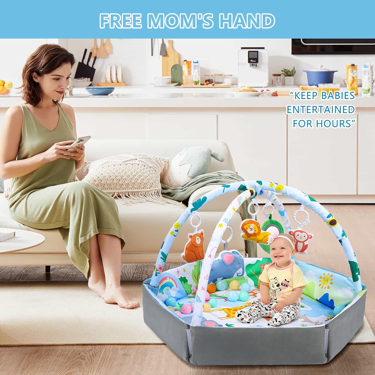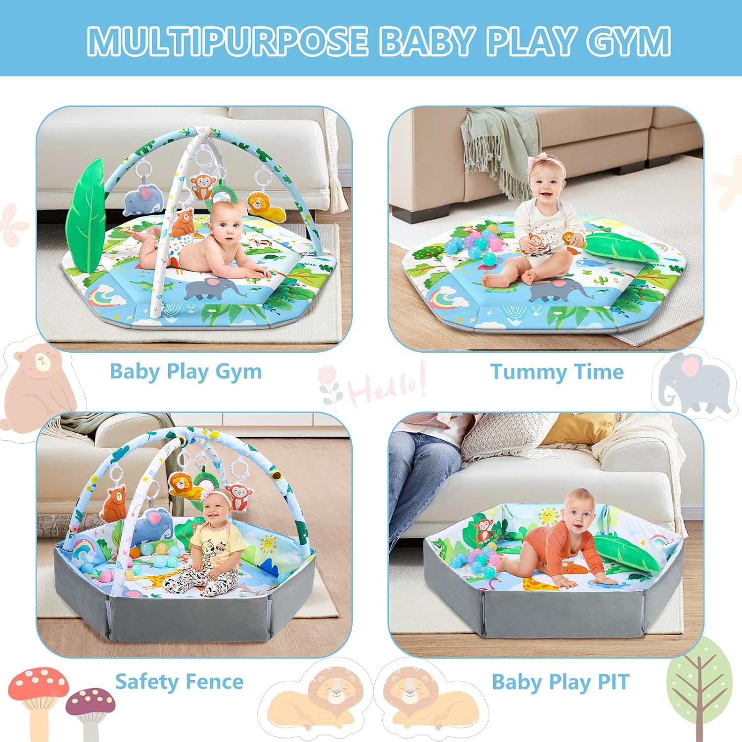 Foldable Encompass Fence : The gymnasium play mat with measurement 45.3*43.3 inches.The foldable fence design is extremely sensible, able to reworking right into a protecting enclosure by folding the perimeters. Could be shortly put in or eliminated.It prevents the newborn from rolling off when they’re youthful and doubles as a ball pit once they’re older, lowering the trouble of scattered balls. This function ensures the newborn’s security and alleviates the stress of toy cleanup for fogeys.