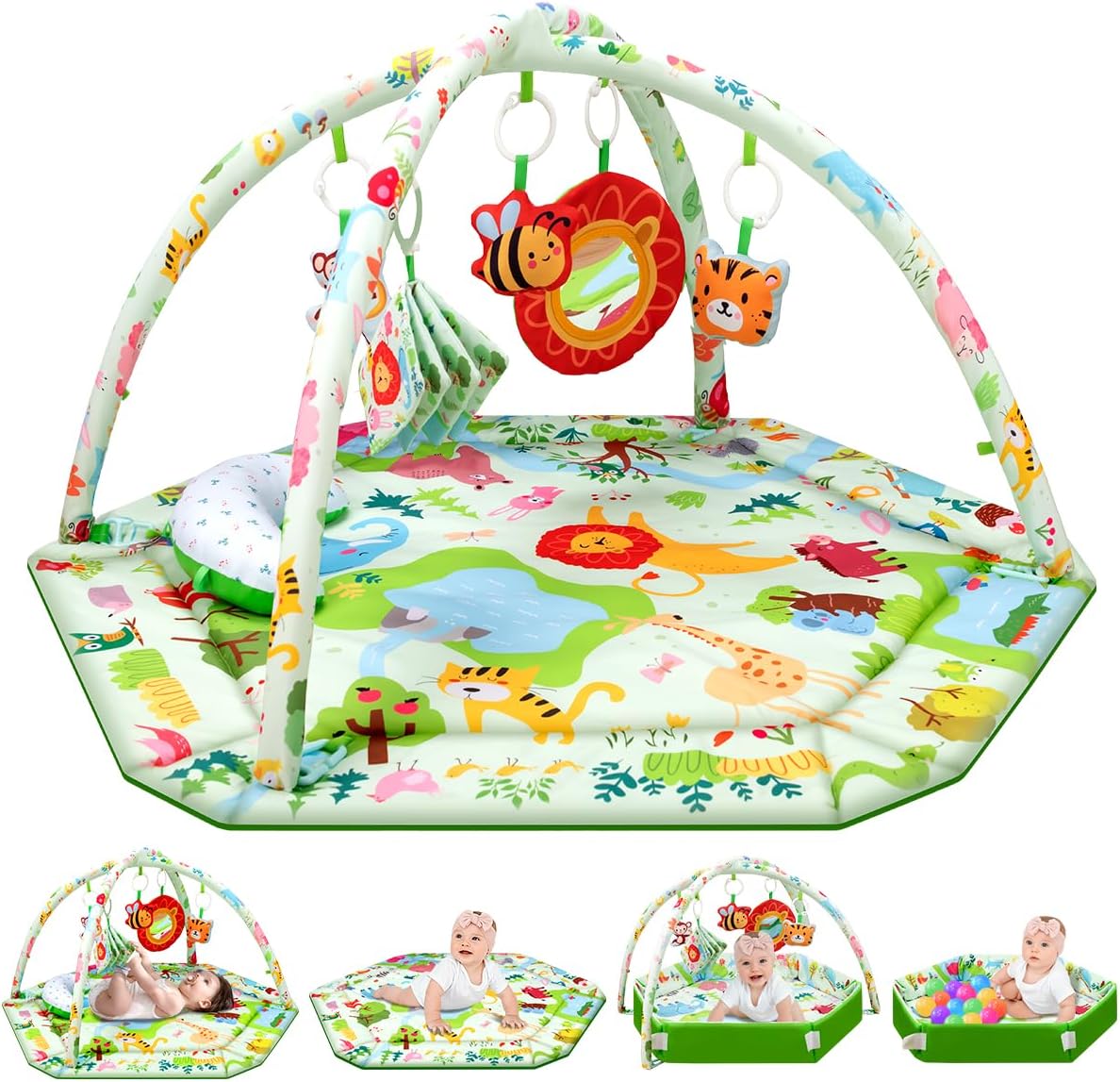 【Early Complete Improvement】6 removable animal-themed equipment:a tiger,a bee,a monkey,a cognitive mirror for self-awareness,a tummy time moon pillow for tactile coaching,and material books for visible coaching.These toys produce sounds when grasped,shaken,or pressed,serving to infants improve hand-eye coordination,imaginative and prescient,listening to,contact,and motor abilities by means of joyful play—absolutely stimulating their sensory improvement