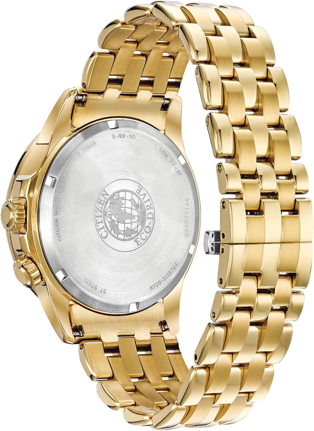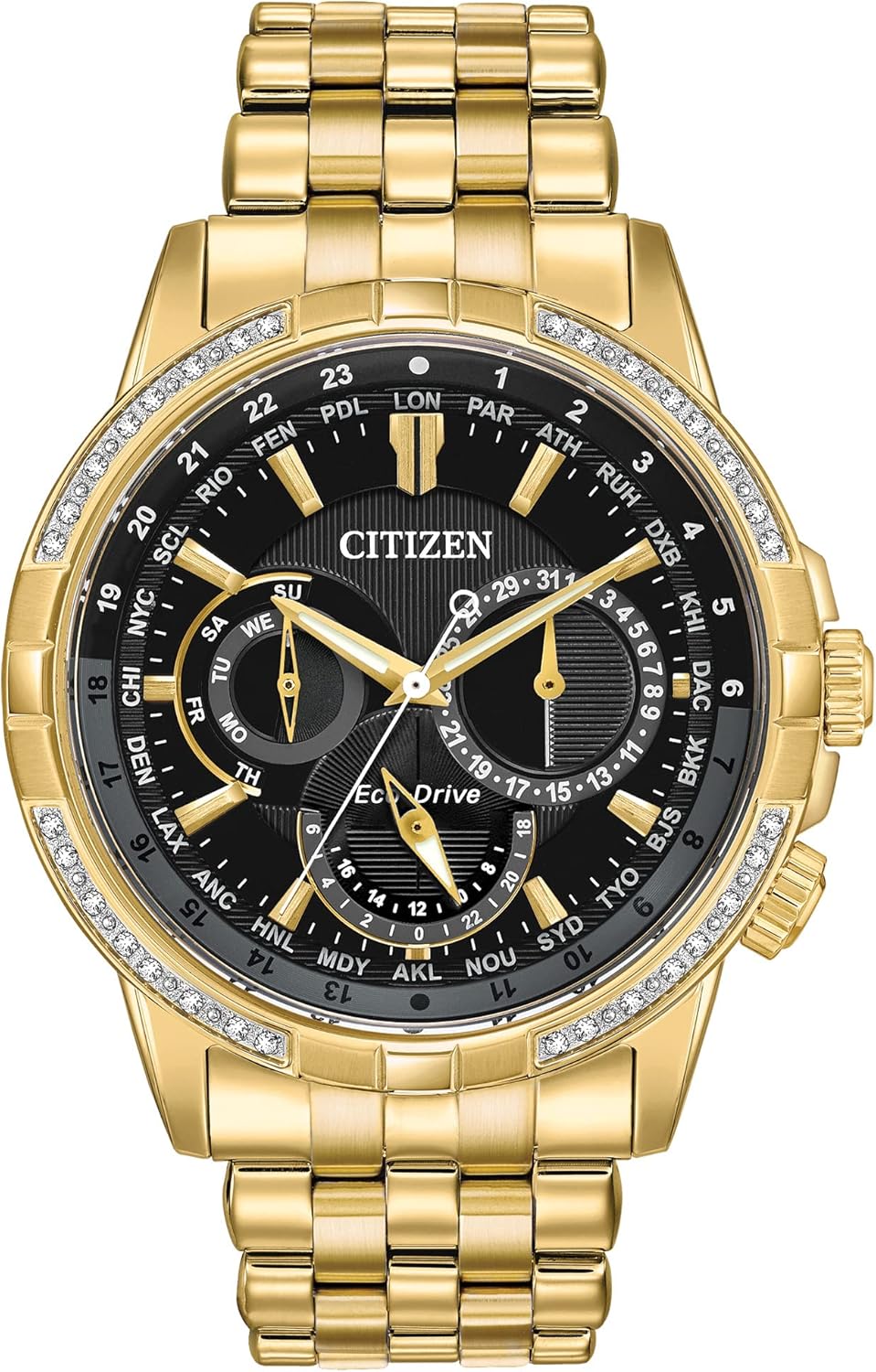 Convey sophistication to your day with the CITIZEN Calendrier. This timeless watch options world time in 24 time zones. Males’s watch featured with gold-tone stainless-steel case and bracelet with black dial adorned with a diamond bezel. That includes our Eco-Drive expertise – powered by gentle, any gentle. By no means wants a battery. Caliber quantity 8729.