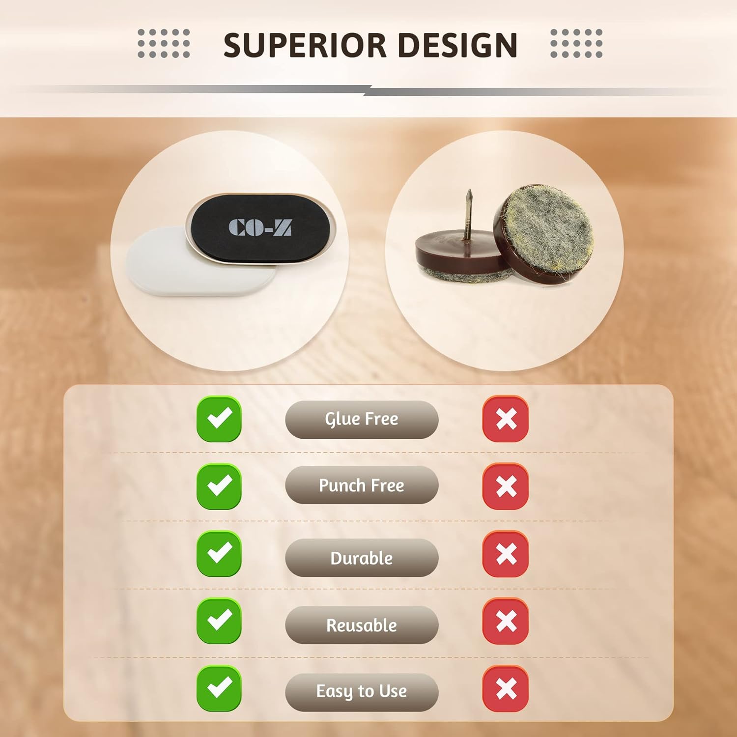 SLIDES LIKE BUTTER: Our 8 polypropylene sliders allow you to glide over several types of surfaces together with carpet, hardwood, laminate, vinyl, or tile flooring with virtually zero friction