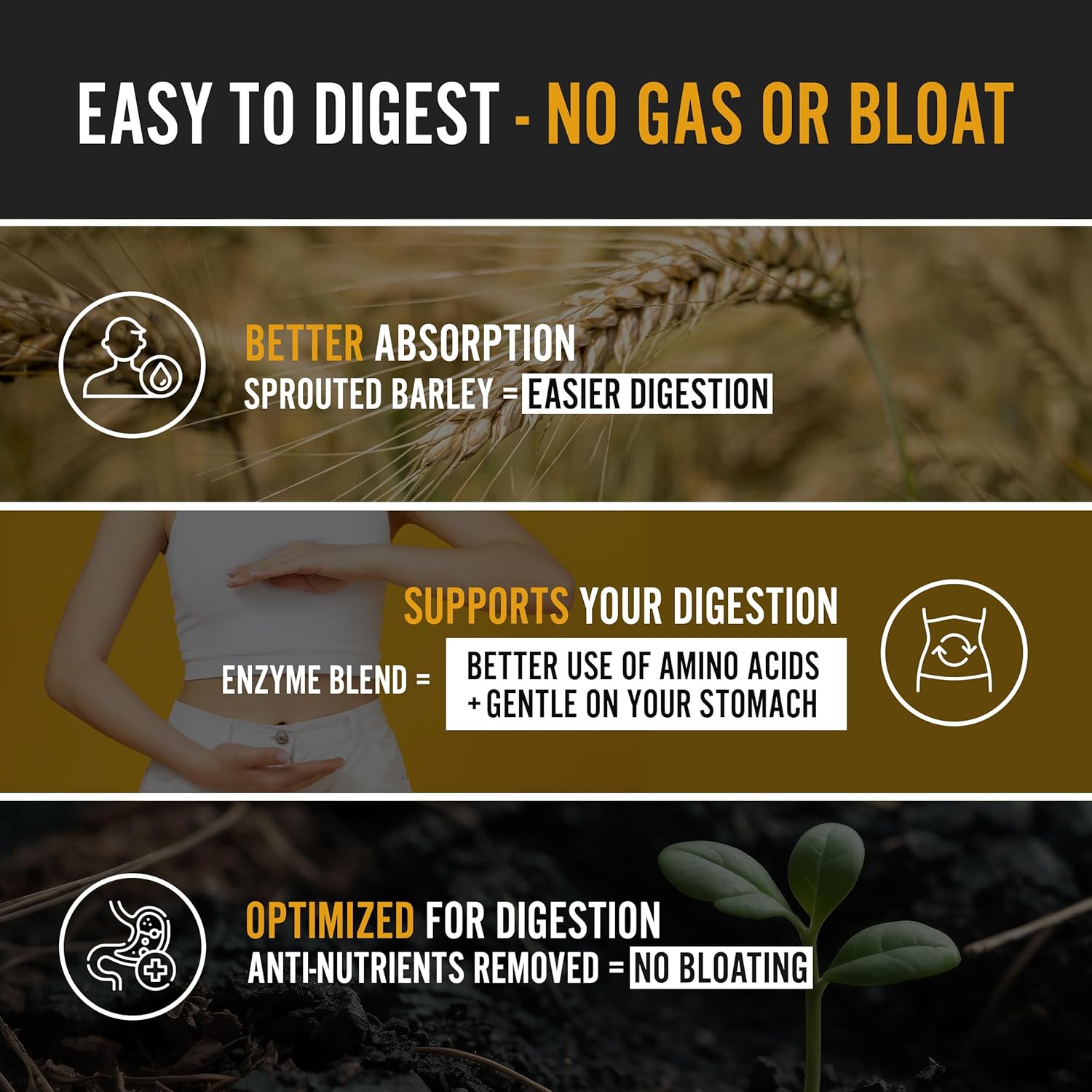 GENTLE ON YOUR GUT – No more protein bloat and discomfort – Our Barley is harvested at the perfect time (just as it’s “sprouting”) making it easy on your stomach; Our Pea protein passes through a process to make it smooth and remove the beany flavor notes; Then, RISE311 chocolate plant protein powder has a special “enzyme blend” that helps your body break down protein into the amino acids it needs and uses to support your health