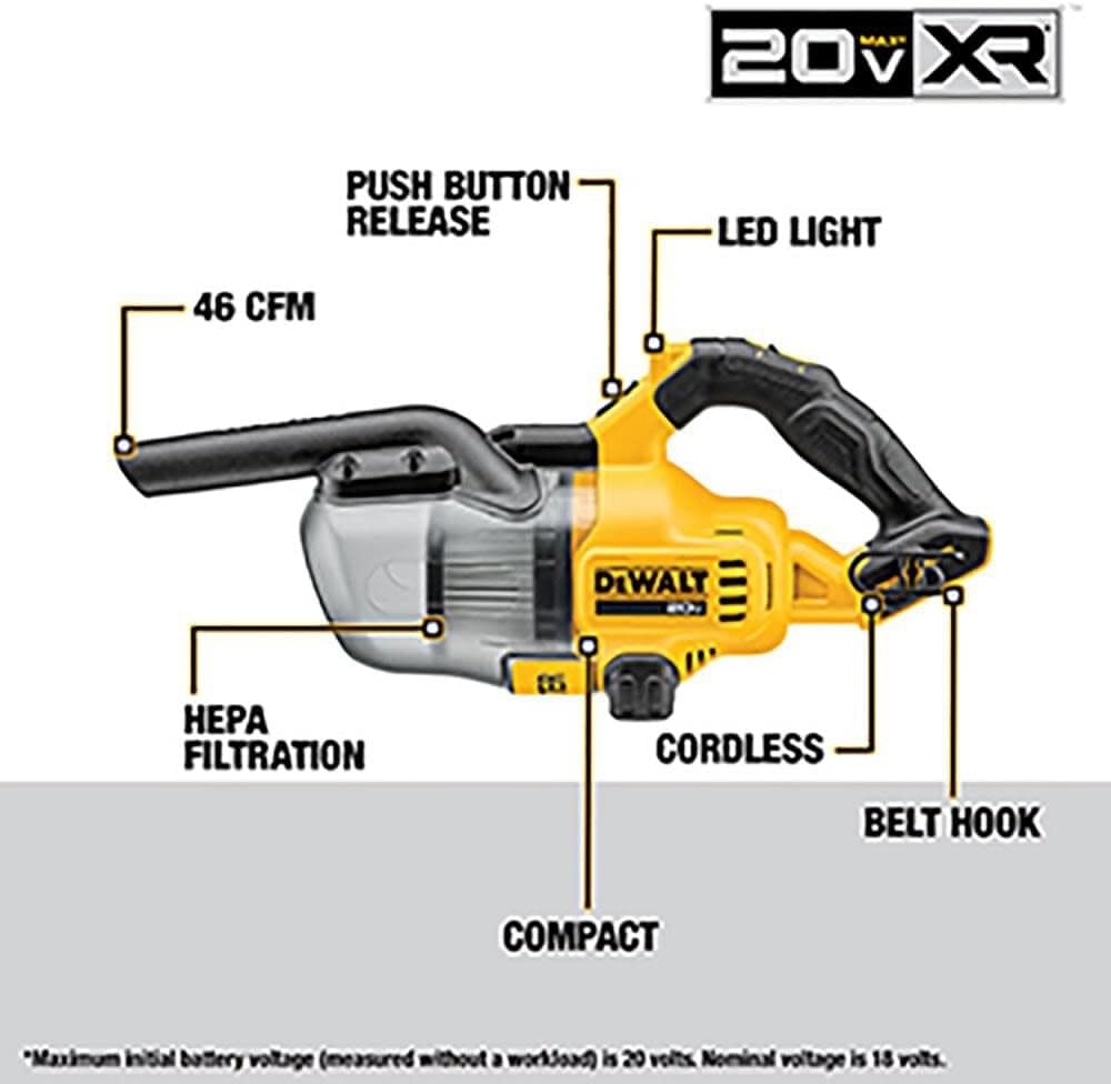 The DEWALT 20V Cordless Dry Hand Vacuum (Instrument solely) is a jobsite cleansing resolution that gives customers with highly effective efficiency (46 CFM) to select up frequent jobsite particles starting from drywall, mud, to small screws and nails. This versatile vacuum comes with 6 totally different cleansing attachment equipment to sort out any cleansing job from flooring stage to overhead. The hand vacuum can be utilized to deal with smaller messes or utilized in mixture with the extension tube and flooring accent to scrub up flooring areas. A brilliant LED gentle illuminates the darkest areas. A HEPA Filter permits for clear environment friendly cleanup of high-quality mud and drywall and follows OSHA Desk 1 Compliance beneath housekeeping guidelines. It comes totally geared up with an extension tube, flooring nozzle, versatile hose, crevice nozzle, gulper brush, spherical brush, belt hook, accent holder, and HEPA filter. As much as 21.4 minutes of runtime per cost utilizing DCB205 battery (offered individually). Can fill as much as 15 tank fills per cost utilizing DCB205 battery (offered individually).
