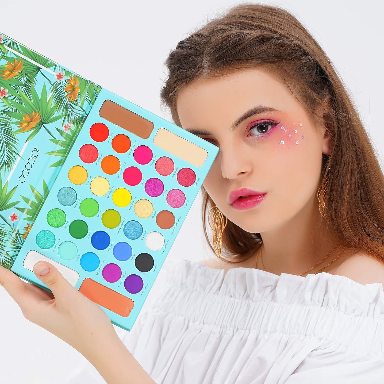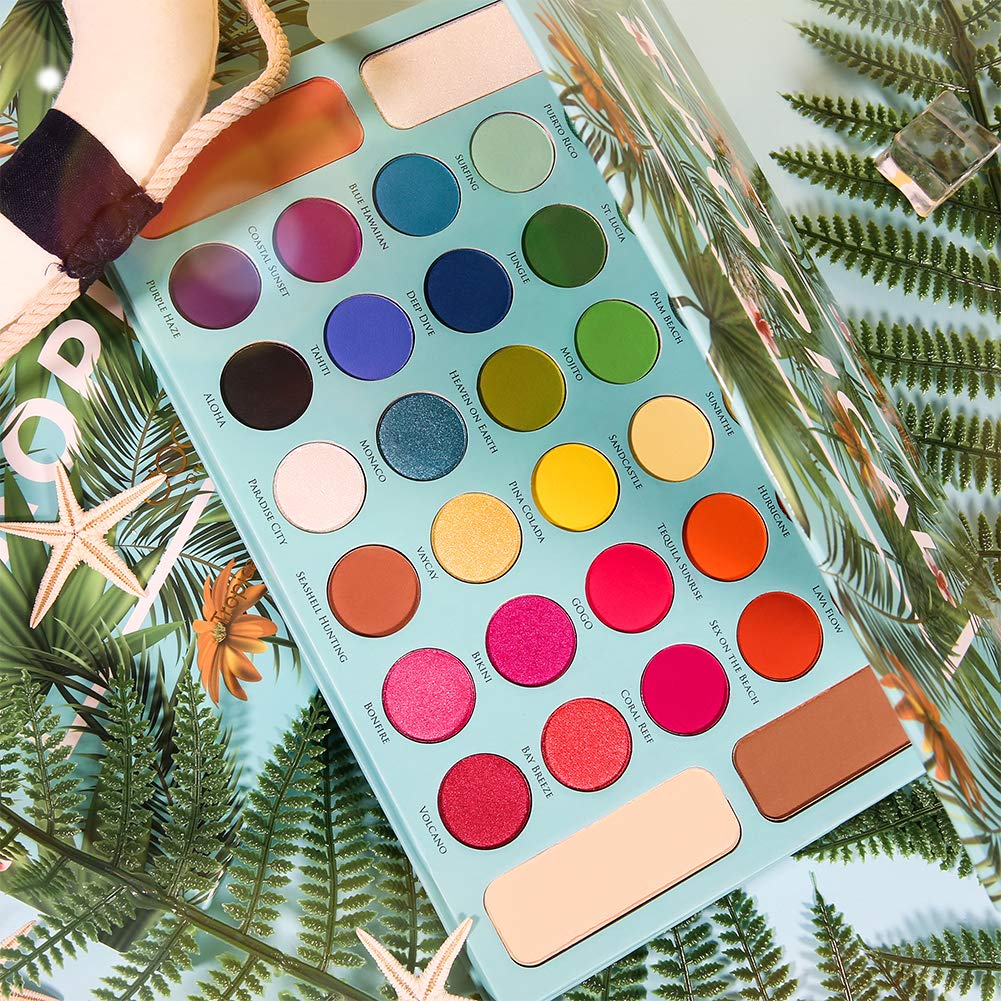 [Tropical Eyeshadow Palette] This eyeshadow palette has 18 matte & 12 shimmer coloration shadows, bronzer blush and highlighter which is impressed by the tropical colourful vibe. It’s good for artistic and attention-grabbing look