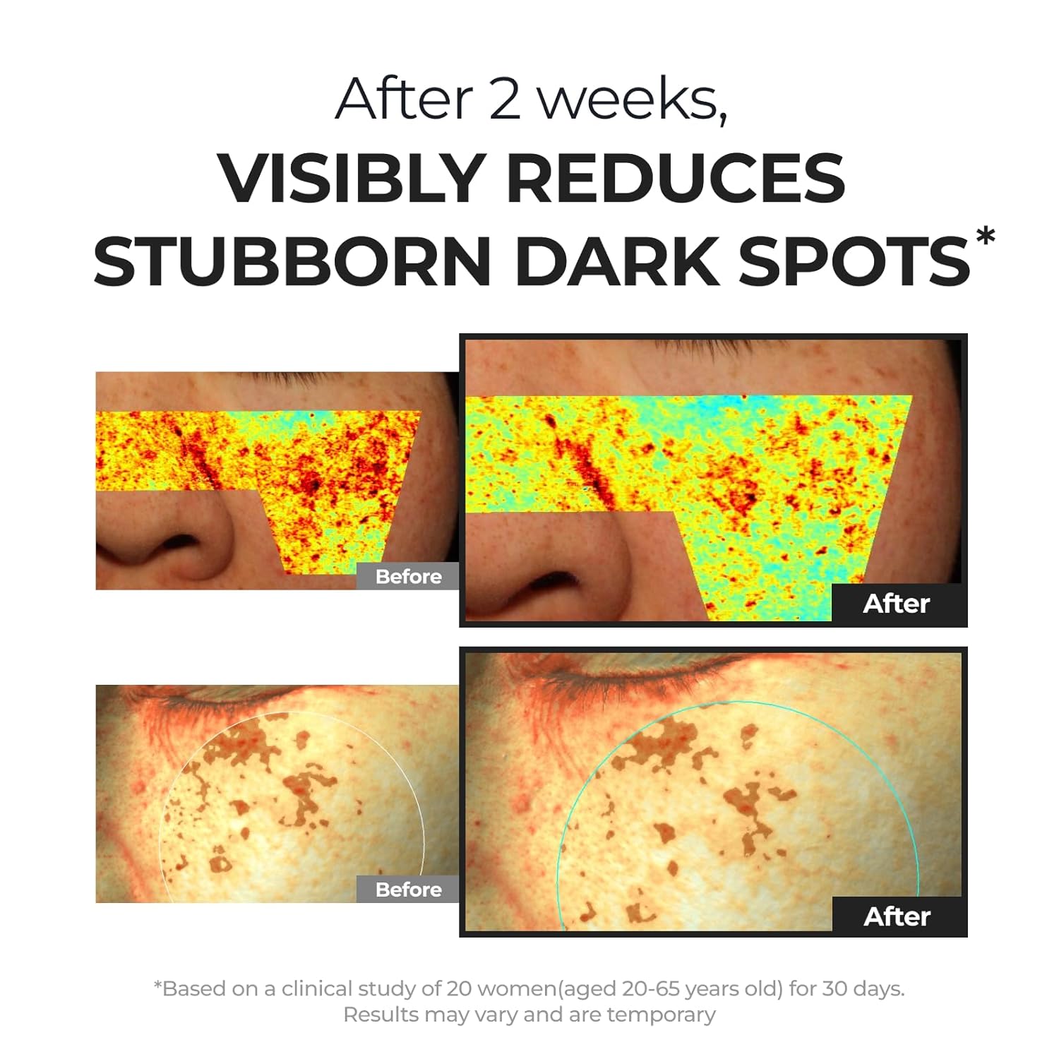 VISIBLE RESULTS IN 2 WEEKS – Expertise measurable darkish spot discount on cheeks, below eyes, and long-term discoloration areas. Medical trials present as much as 43.8% lower in seen spots and 22.6% discount in under-skin pigmentation inside 14 days.