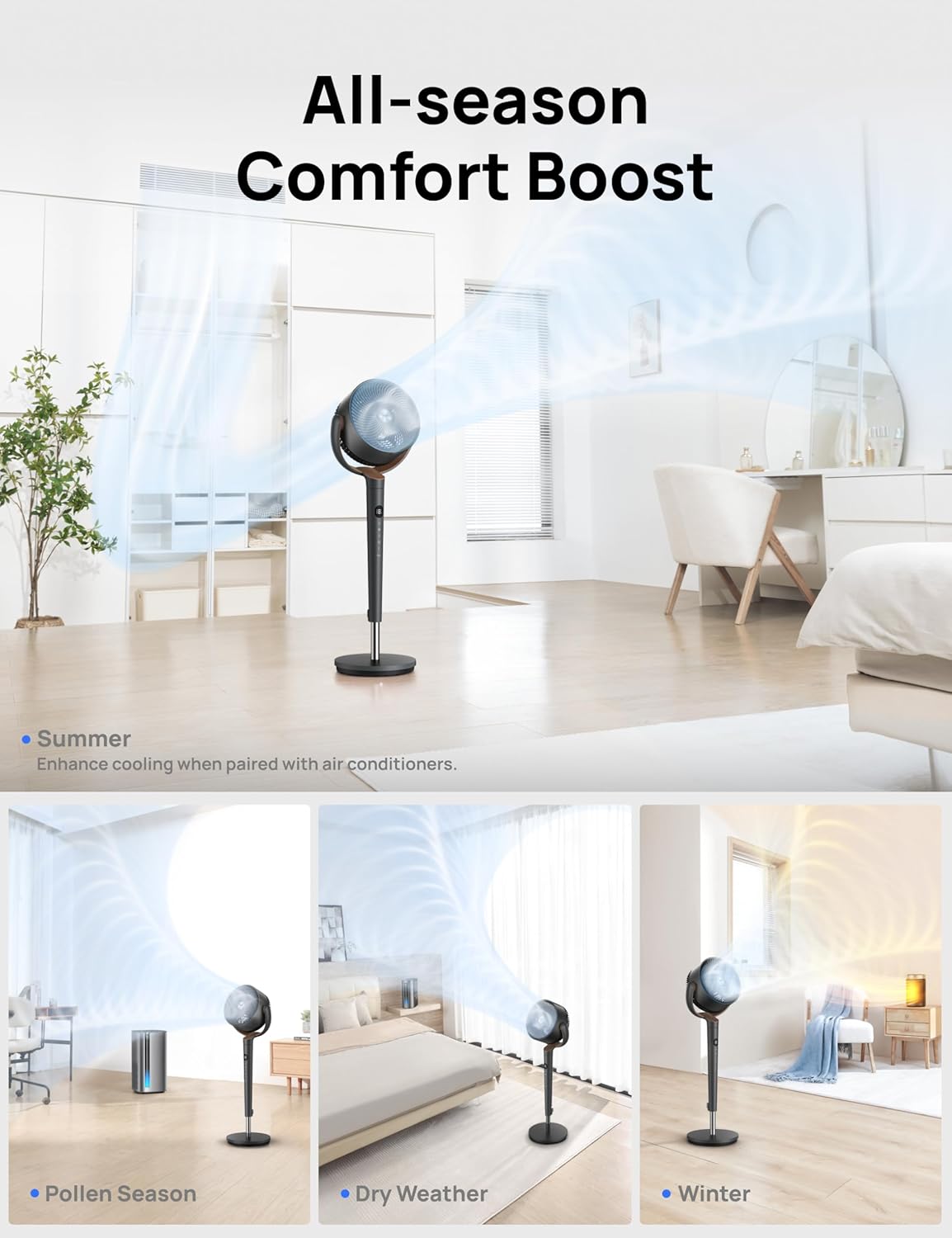 𝑶𝒏𝒆 𝑭𝒂𝒏, 𝑴𝒖𝒍𝒕𝒊𝒑𝒍𝒆 𝑭𝒖𝒏𝒄𝒕𝒊𝒐𝒏𝒔: From circulating air round, to quiet highly effective cooling, Dreo TurboPoly Fan for bed room combines a pedestal fan, an oscillating fan, and an air circulator into one, which adapts vastly to all of your wants. Do not get confused by its form, the 9 wind speeds and 4 modes of the Dreo standing fan do way more than a fan.