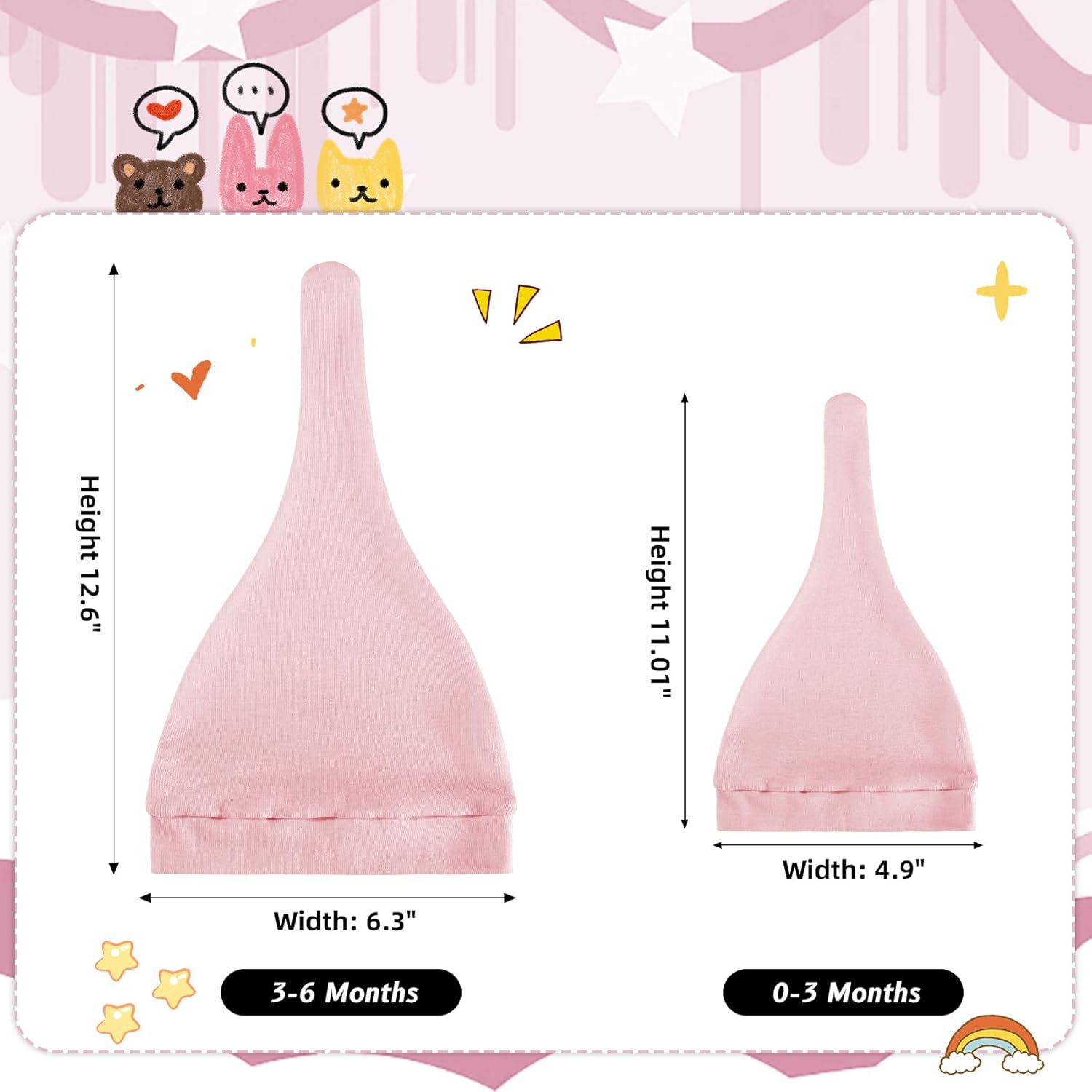 This child hat is made in two sizes, for 0-3 Months child: Top 11.01 ” Width: 4.9″ ; for 3-6 Months child: Top 12.6 ” Width: 6.3″