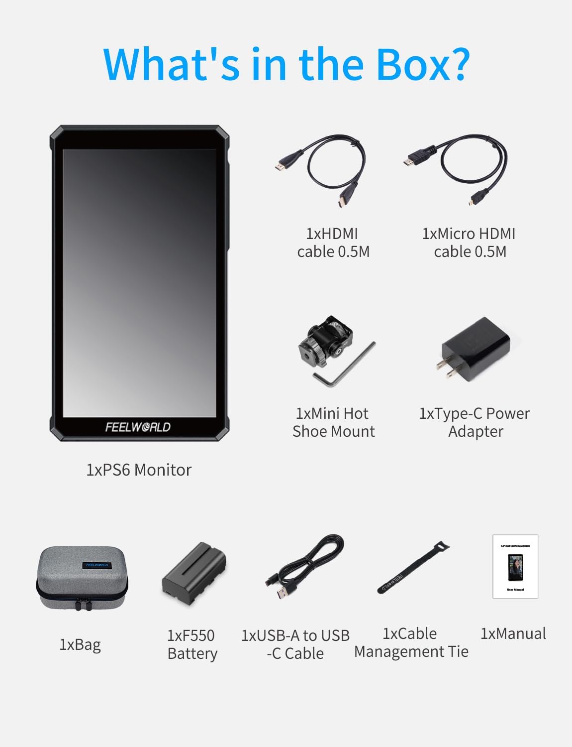 [Package,Customer Support]1x FEELWORLD PS6 Digital camera Video Monitor,1xF550 Battery,1xBag,1xHDMI cable 0.5M,1xMicro HDMI cable 0.5M,1xType-C information cable and connector,1xMini Scorching Shoe Mount,1xCable Administration Tie,1xManual.FEELWORLD ensures worry-free experiences with 24/7 technical help and devoted after-sales service, backed by trusted reliability
