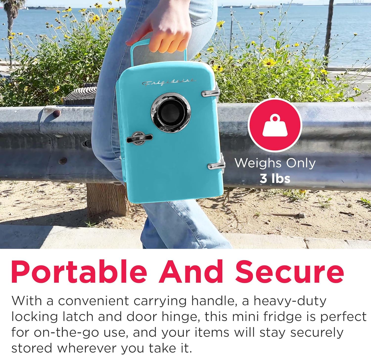Transportable & Safe – Compact and moveable with a handy carrying deal with, this mini fridge cooler is ideal for on-the-go use, weighing solely 3lbs. With a heavy-duty locking latch and door hinge, your gadgets will keep securely saved wherever you are taking it.