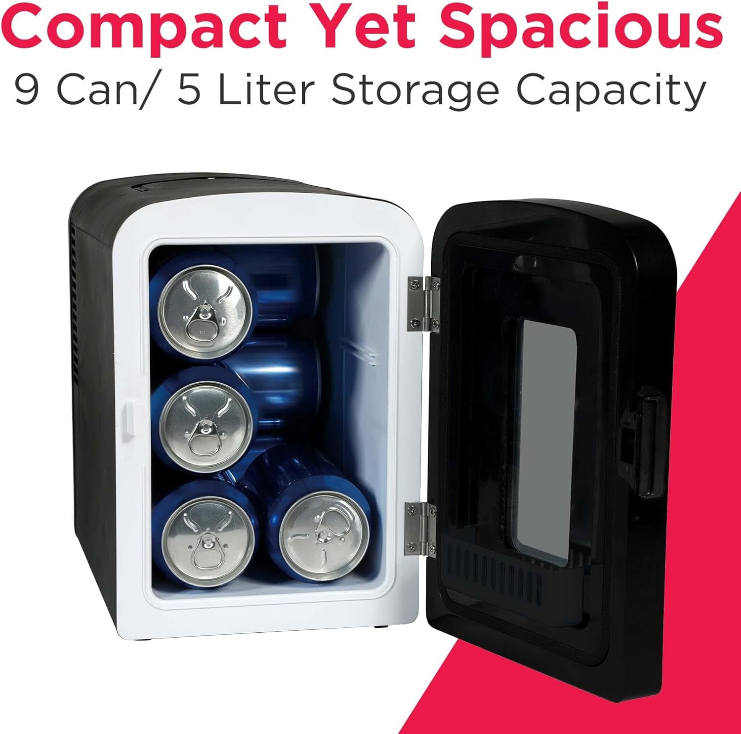 MINI FRIDGE, MAXIMUM CHILL. The Portable Personal Fridge keeps your food and drinks the perfect temperature while at home and on the go. The ultimate versatile cooler, this mini fridge starts cooling with just the flip of a switch. Cools up to 32°F below ambient temperature, and warms up to 140°F at an ambient temperature of 75°F. Compact space saving design and lightweight features make it easy to take with you anywhere, yet can still fit your needs; 10 Liter capacity chills 15 12 oz. cans, while a removable shelf makes it easy to store milk, juice, yogurt, bottles, smoothies, cheese, fruit, coffee, soup, and many more home cooked meals or beverages. Perfect for personal spaces, bedrooms, offices, hotels, boats, soccer games, sporting events, backyard BBQ, pool parties and more! Conveniently plugs into standard home outlets. 100% Freon-Free and and cETL approved with advanced safety technology for long-lasting durability.