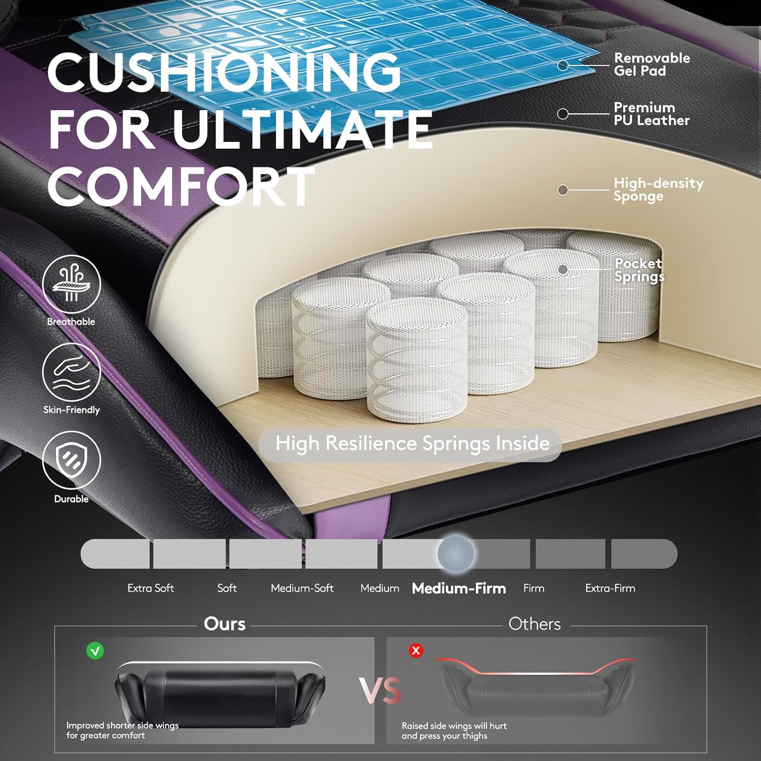 Final Consolation & Ergonomic Assist: Expertise sofa-like consolation with a thick seat cushion that includes high-density foam and elastic pocket springs that evenly distribute physique stress. The shorter aspect wings accommodate a wider vary of physique shapes whereas guaranteeing thigh consolation. The contoured backrest helps the pure curve of your backbone, whereas the adjustable therapeutic massage lumbar pillow and headrest assist relieve again and neck pressure. Breathable supplies hold you cool and cozy even throughout lengthy classes.