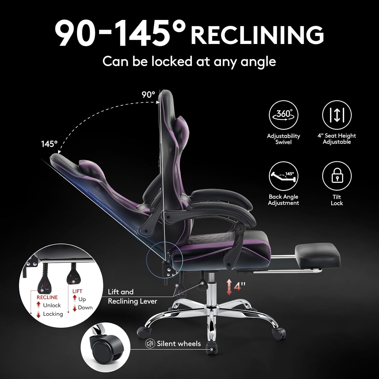 Multifunctional Design: Good for each gaming and workplace use. With a 90°-145° recline vary, retractable footrest (permits for cross-legged sitting), 4-inch top adjustment,360° swivel, and smooth-rolling silent wheels, this chair makes it simple to transition between work, gameplay, and relaxation.