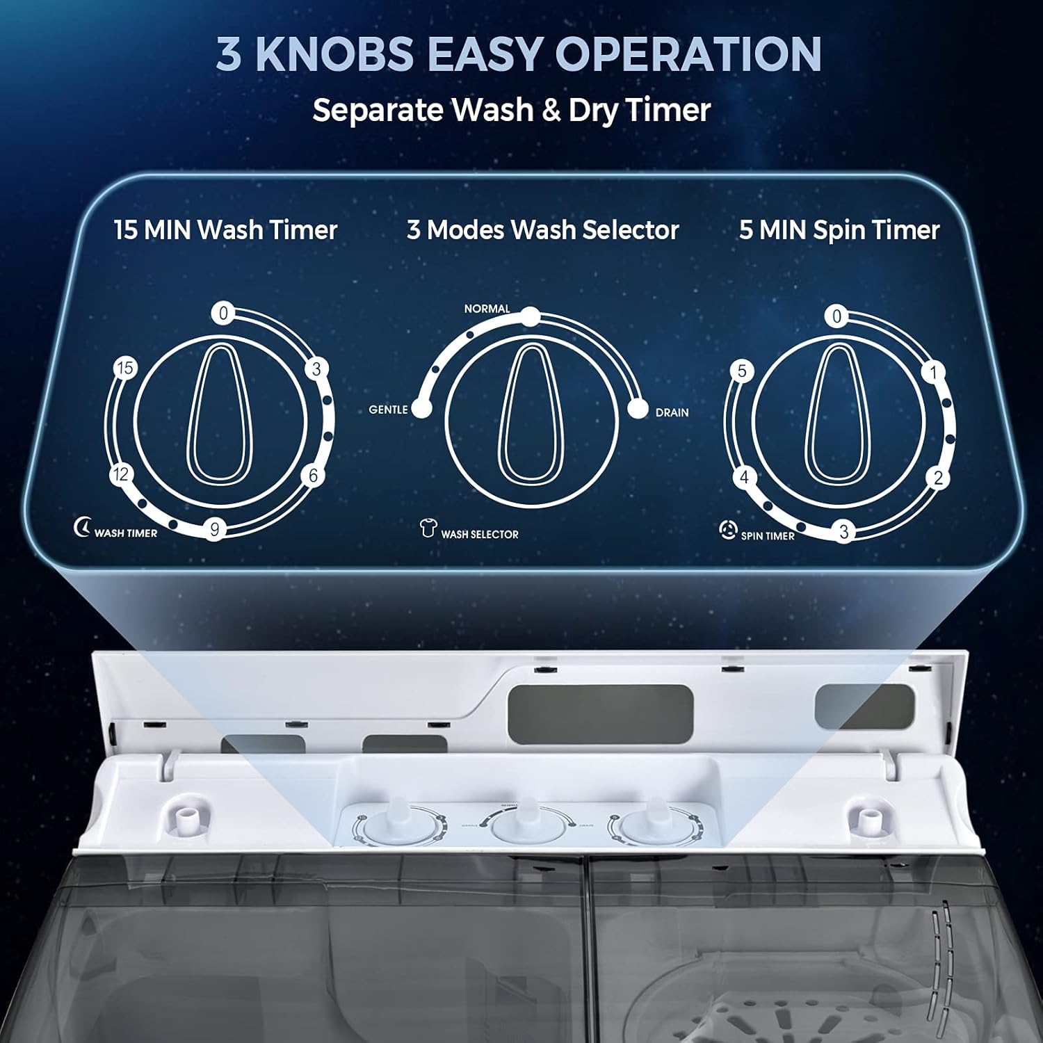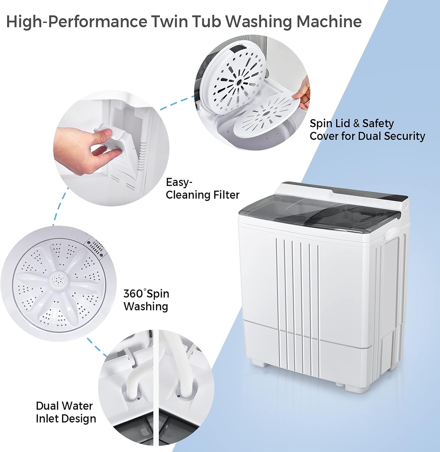 [21LBS Capacity Meets Daily Needs]: This twin tub washer is designed with 14.4 lbs capability for laundry tub and 6.6 lbs capability for drying tub. It may accommodate your shirts, denims, sweaters, underwear, or jacket to fulfill your each day wants.