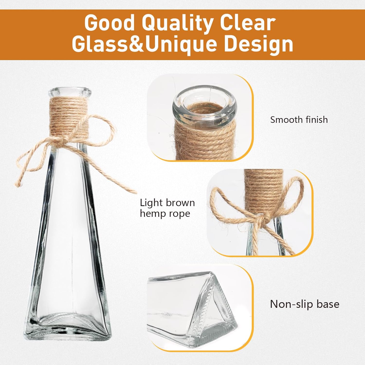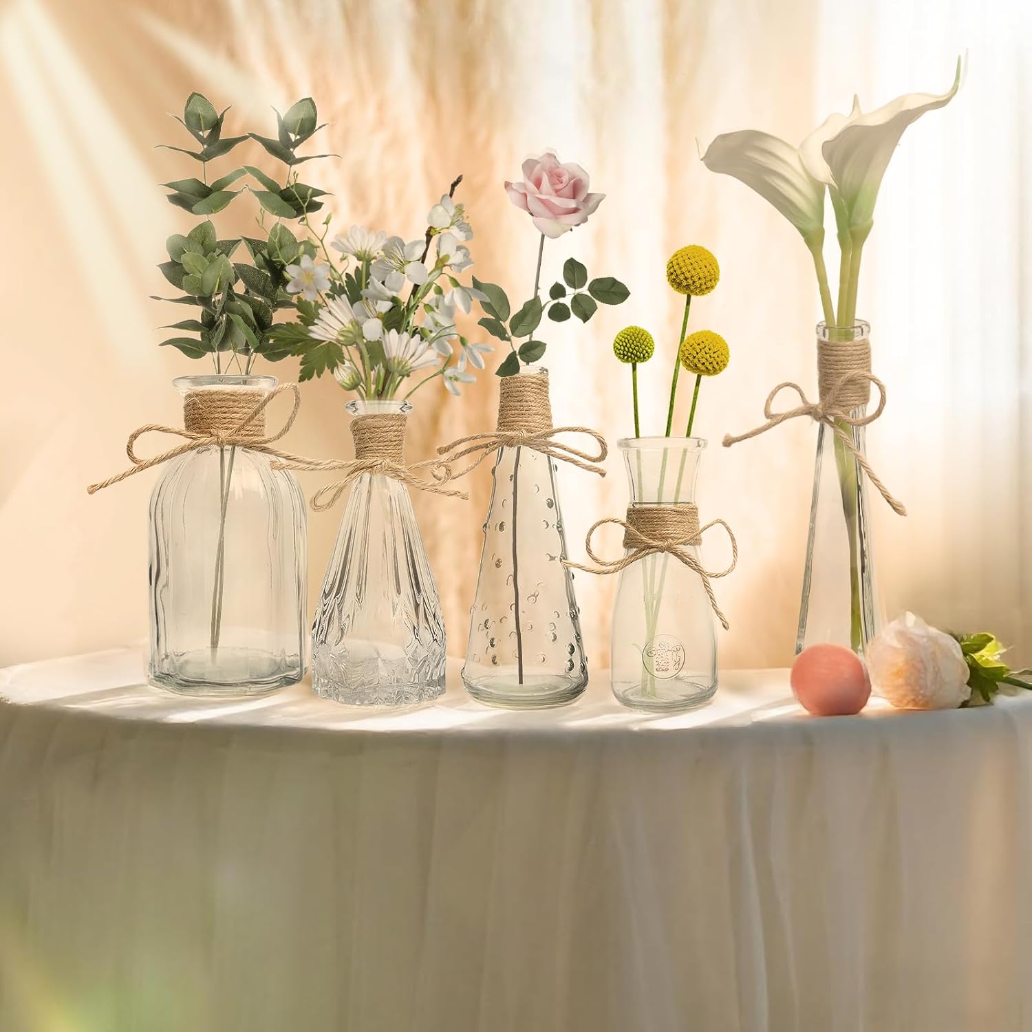 Classic Small Flower Vase with Hemp Rope: Our 12 pcs clear glass vases every wrapped in a pure hemp rope accent, the country hemp rope offers an enthralling boho contact – additionally simply detachable,excellent for creating gorgeous centerpieces on any desk
