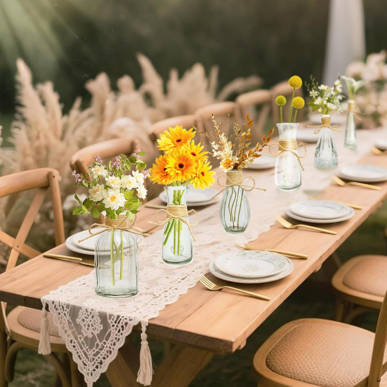 Our bud vases set of 12 encompasses a delicately wrapped rustic rope accent, mixing farmhouse enchantment with boho magnificence,use individually as delicate bud vases or group them for a fascinating centerpiece show at weddings, events, or on a regular basis residence decor.