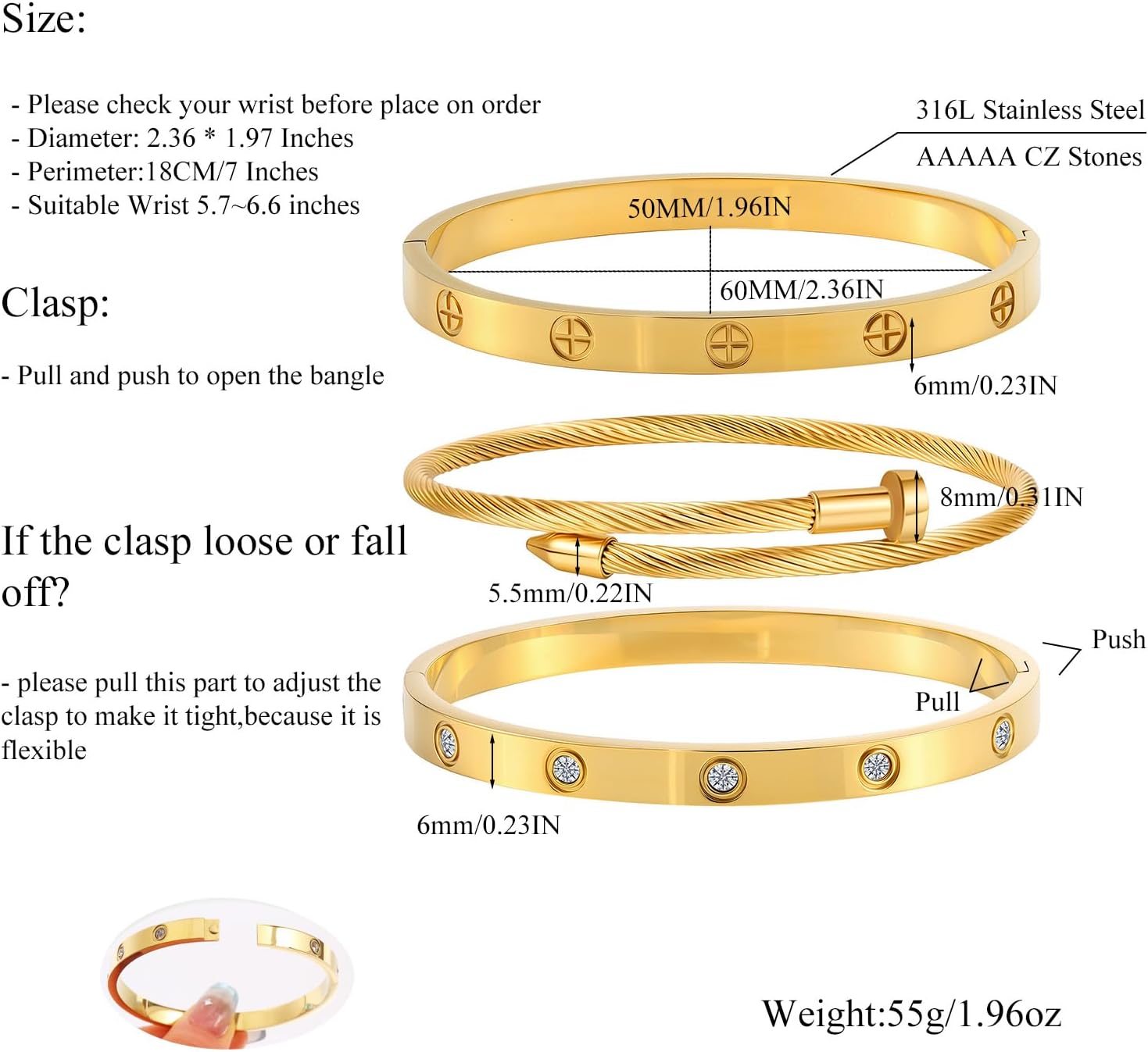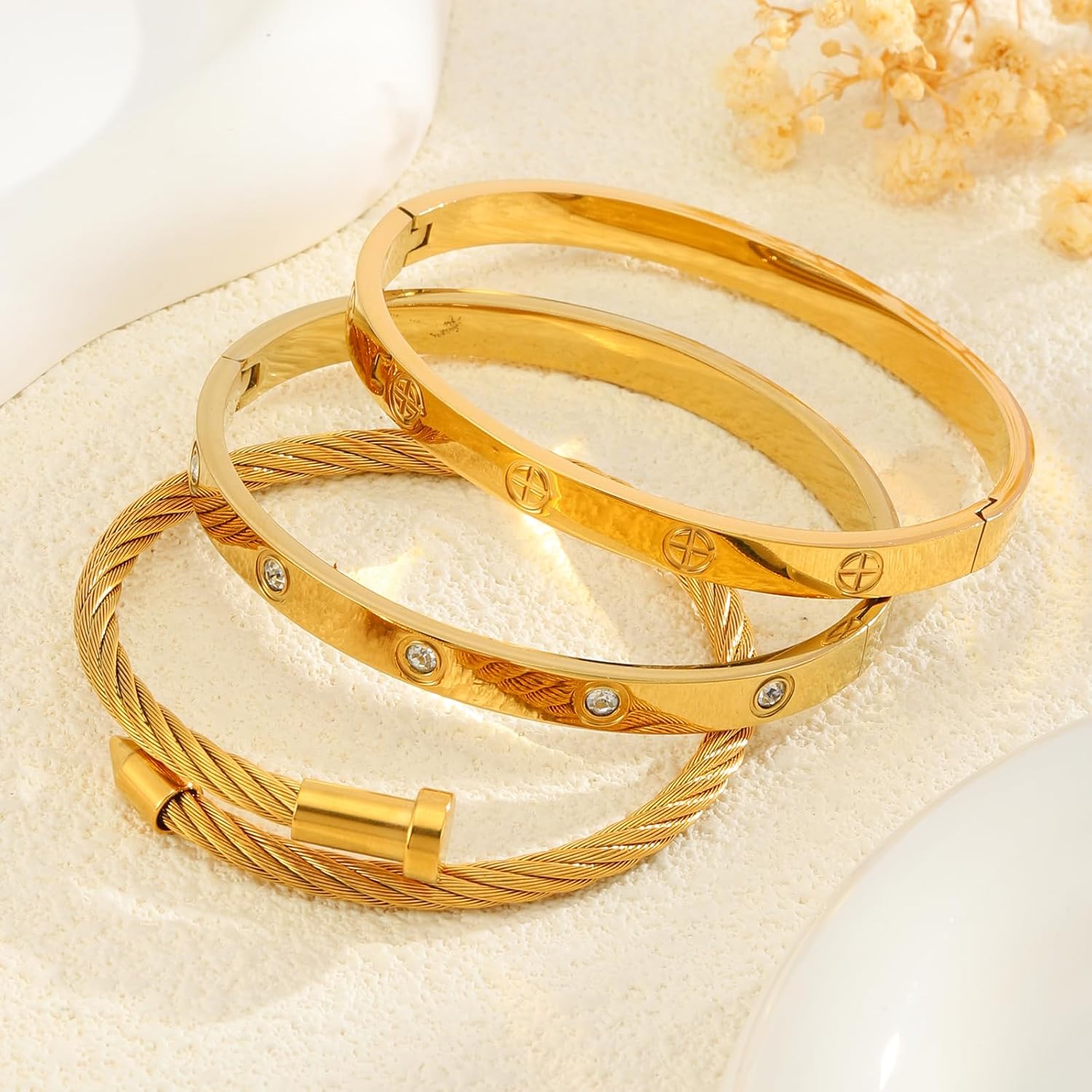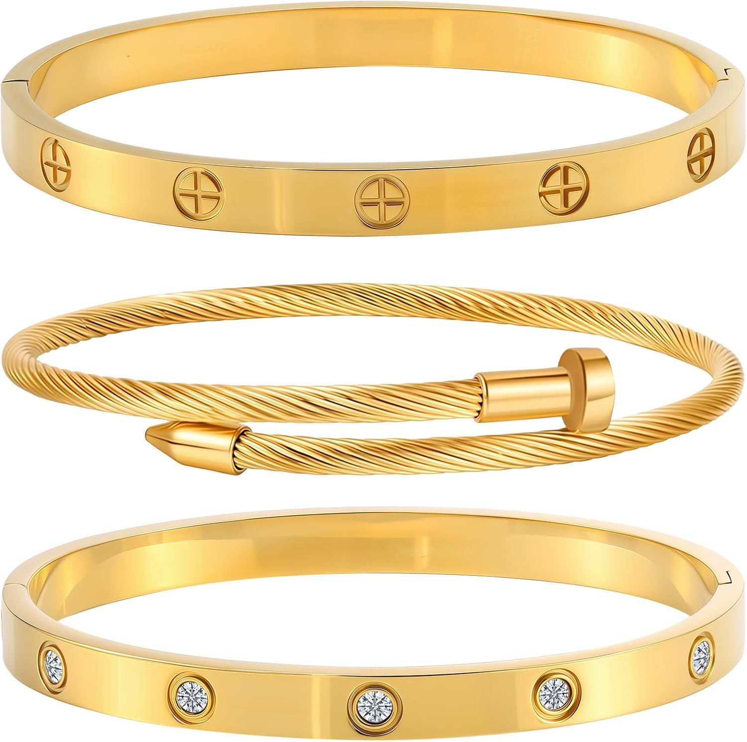 Elevate your fashion with this gorgeous set of three gold-toned stackable bangles. Every bit on this assortment options distinctive crystal elaborations – one with a chic channel of sq. crystals, one other with strategically positioned spherical crystal accents, and the third with a classy crystal-adorned cylindrical element. Crafted from sturdy stainless-steel with an opulent gold end, these bracelets keep their brilliance whereas being comfy for on a regular basis put on. The versatile design lets you put on them individually or stacked collectively for a extra dramatic impact. Good as a considerate birthday reward or a deal with for your self, these bangles symbolize friendship and love whereas including a contact of sparkle to any outfit. The safe closure ensures these stunning items keep in place all through your day. These timeless equipment transition seamlessly from informal daytime put on to night magnificence.