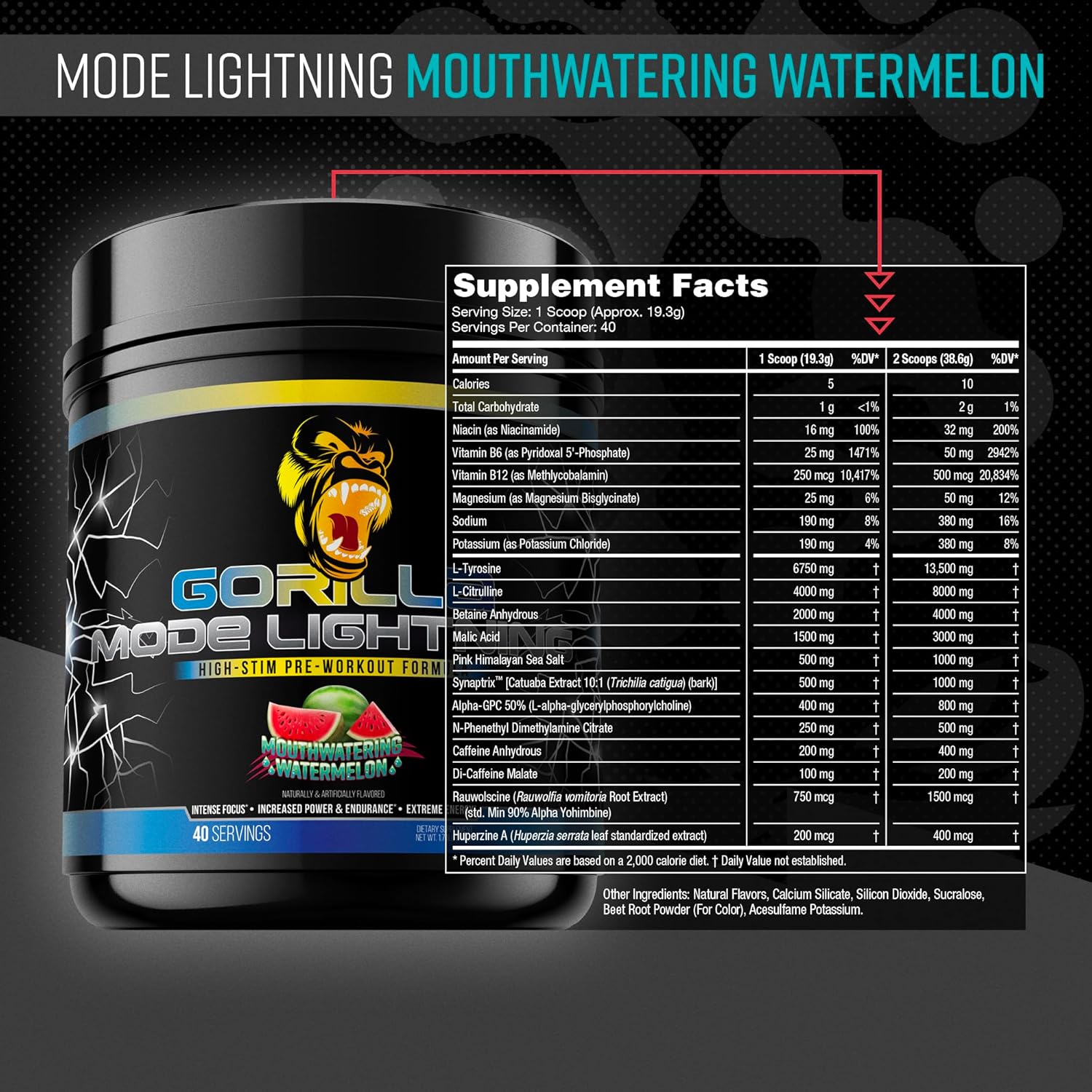 INTENSE ENERGY & LASER FOCUS – That includes ~16.5g of stimulants and nootropics together with 13,500mg of L-Tyrosine, 800mg of Alpha-GPC, and 550mg of Caffeine yield. Gorilla Mode Lightning delivers explosive power, laser-sharp focus, and unmatched psychological readability to energy by means of intense exercises and demanding coaching classes.