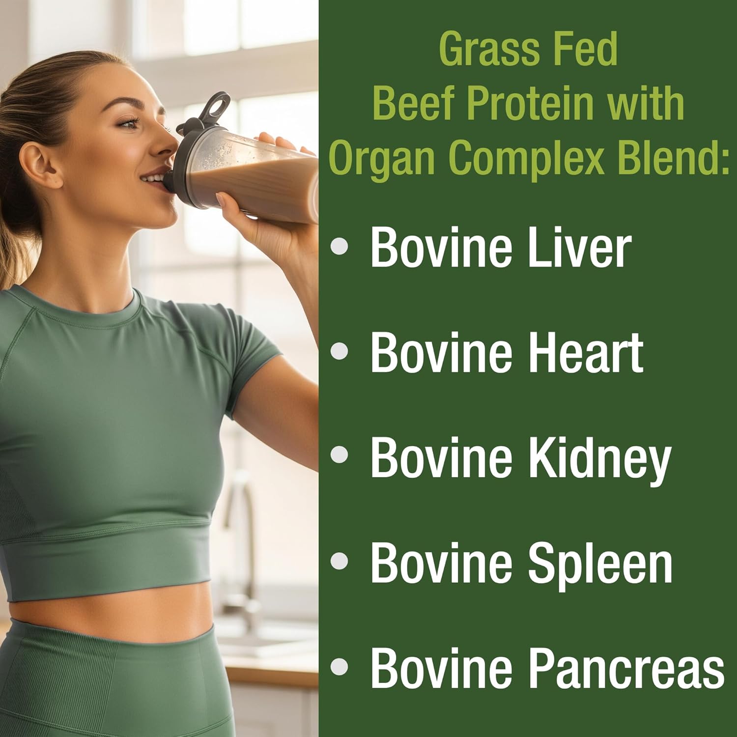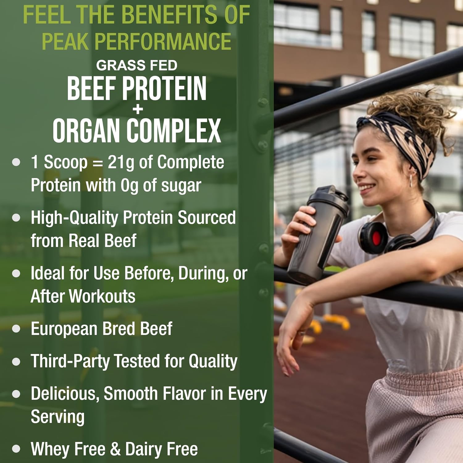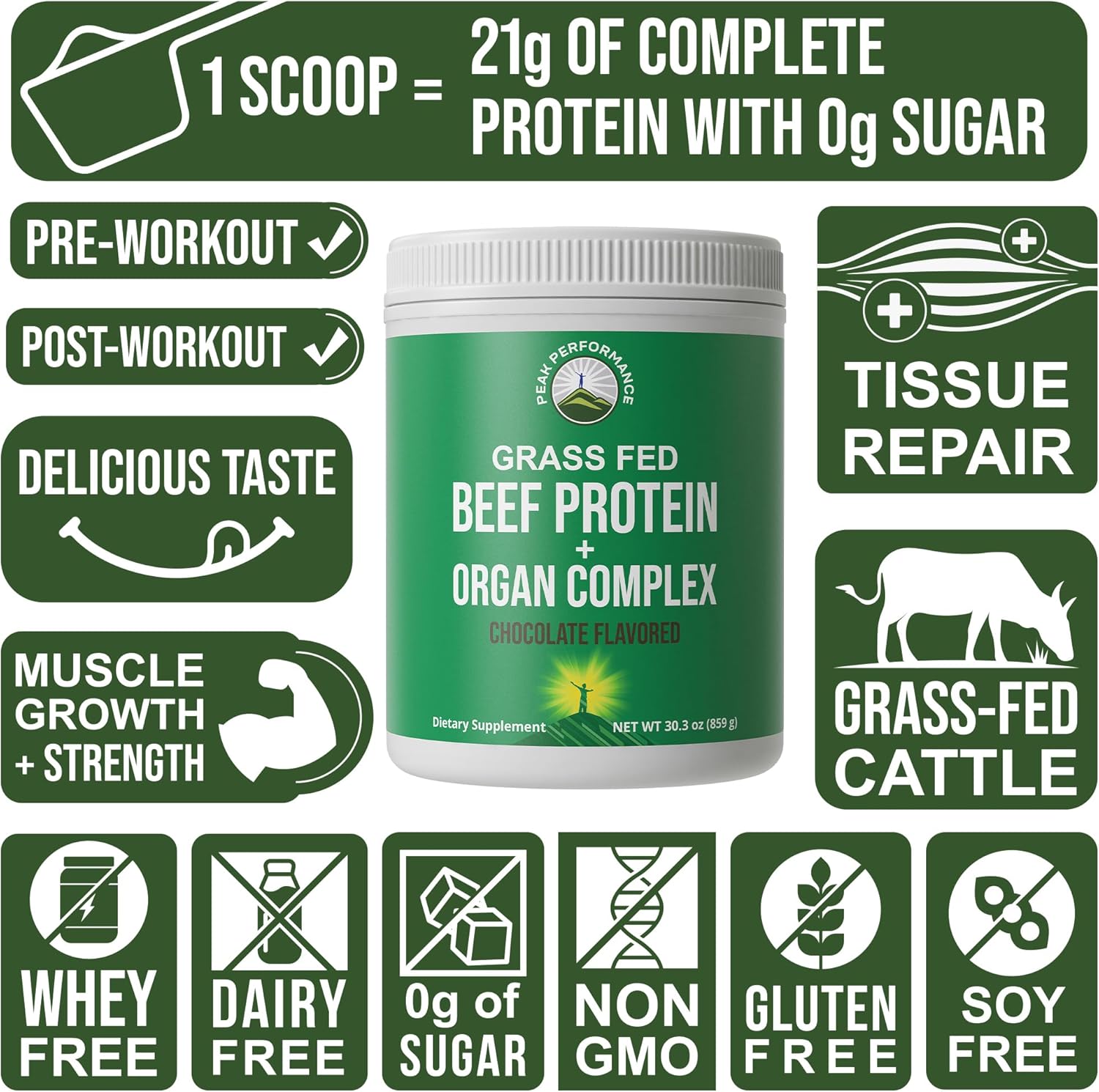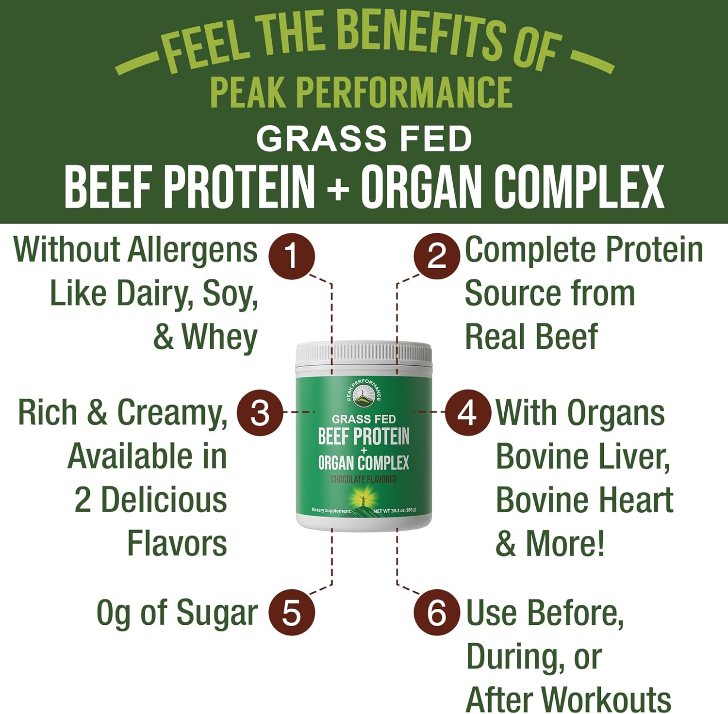 1 Scoop = 21 grams of Complete Grass Fed Beef Protein with 0g of sugar PLUS an Organ Complex Blend! – Peak Performance Grass Fed Beef Protein with Beef Organ Complex is a superior alternative to protein sources containing common allergens such as dairy, soy, and whey. Use before, during or after workouts and between meals for extra protein. Blend for a better mix.