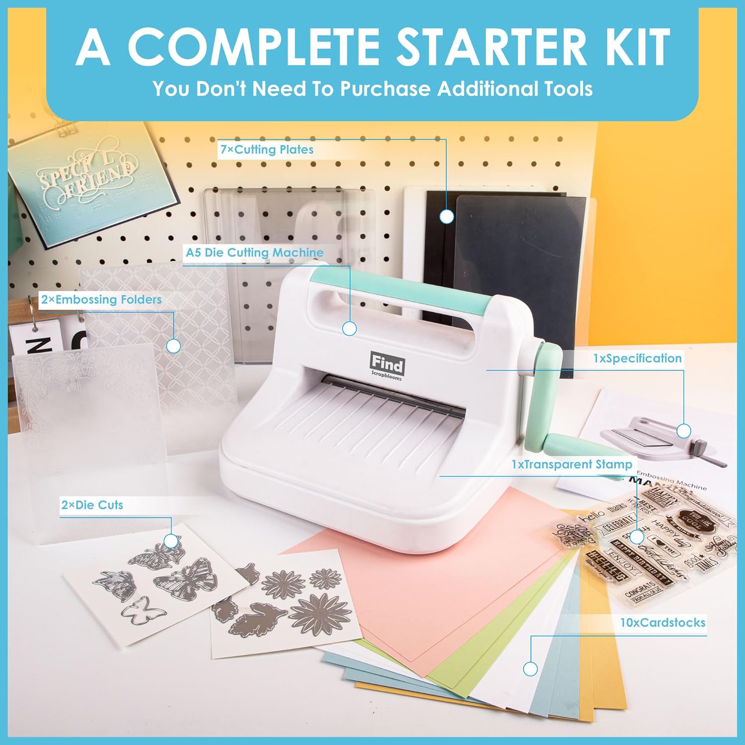 A5 Die Slicing and Embossing machine package for inexperienced persons: It has all the pieces you want, die slicing machines for crafting including10pcs colourful cardstock paper,2 set die cuts, 1 set clear stamp, 2pcs embossing folder, 2pcs 3mm plate ,1pc 5mm plate,1pc 13mm plate.