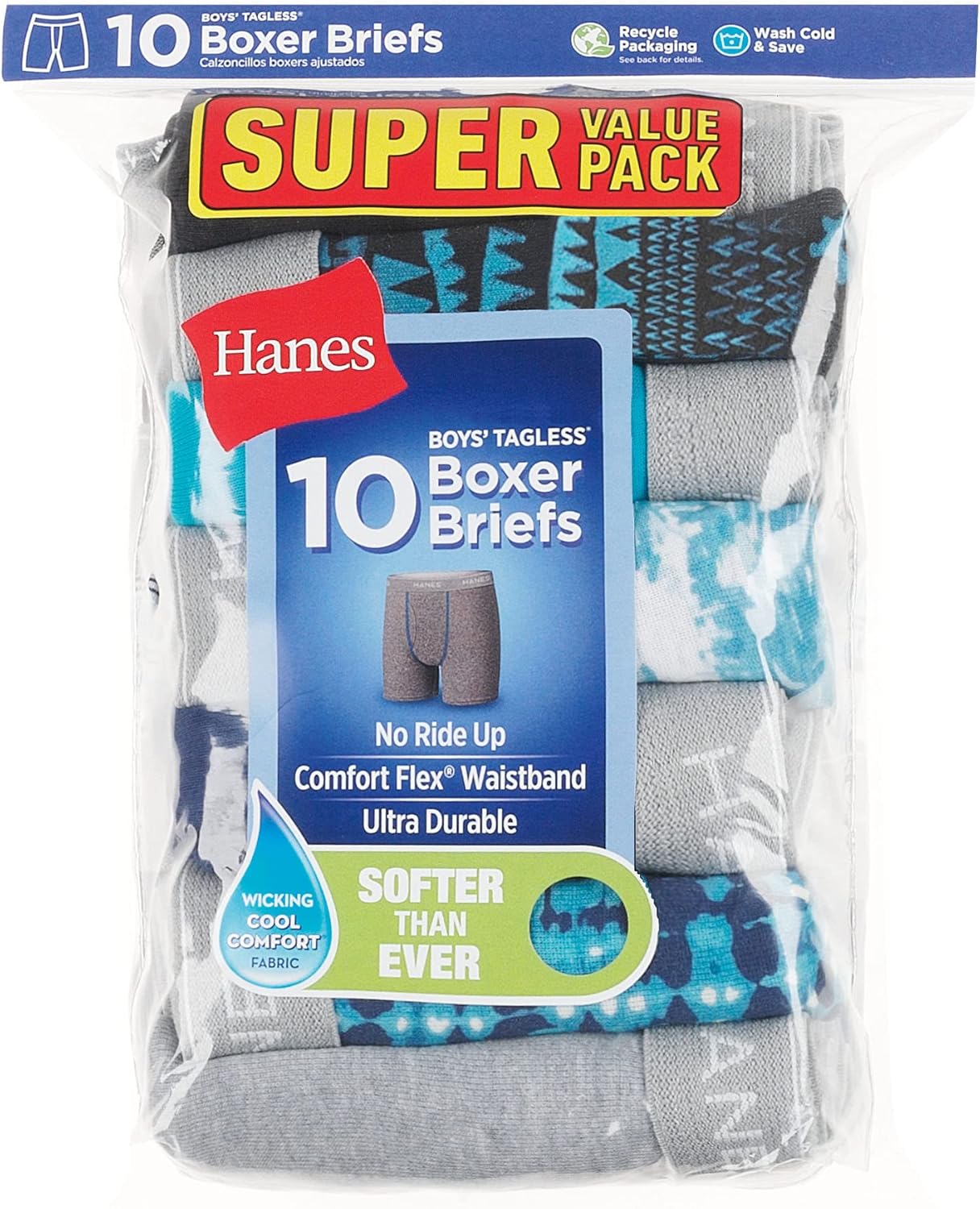 Hanes®’s boys’ boxer briefs are made of 100% cotton that’s ultra-soft and breathable. They’re designed with Cool Comfort™ technology that helps wick away moisture to keep him cool and dry all day long. And the Comfort Flex® waistband keeps his boxer brief underwear from pinching and binding. This boys’ underwear is also constructed with no-ride-up leg bands and a tagless interior for itch-free comfort. These soft cotton boxer briefs are available in multiple size options, from boys’ sizes Small, Medium, or Large, so you can get a set for every little guy in your family.