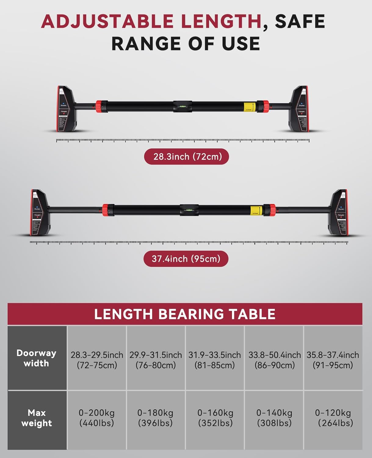 【No Drilling & Straightforward Set up】No screws and No drilling,(Word: Make certain the set up distance and wall set up are possible earlier than buying.) pull up bar no screw might be shortly put in in 4 easy steps: twist each side, use the bubble degree to make sure that each side are in the identical horizontal airplane, proceed to rotate till each side can’t rotate, lock the knob, and be sure that it’s mounted earlier than use.