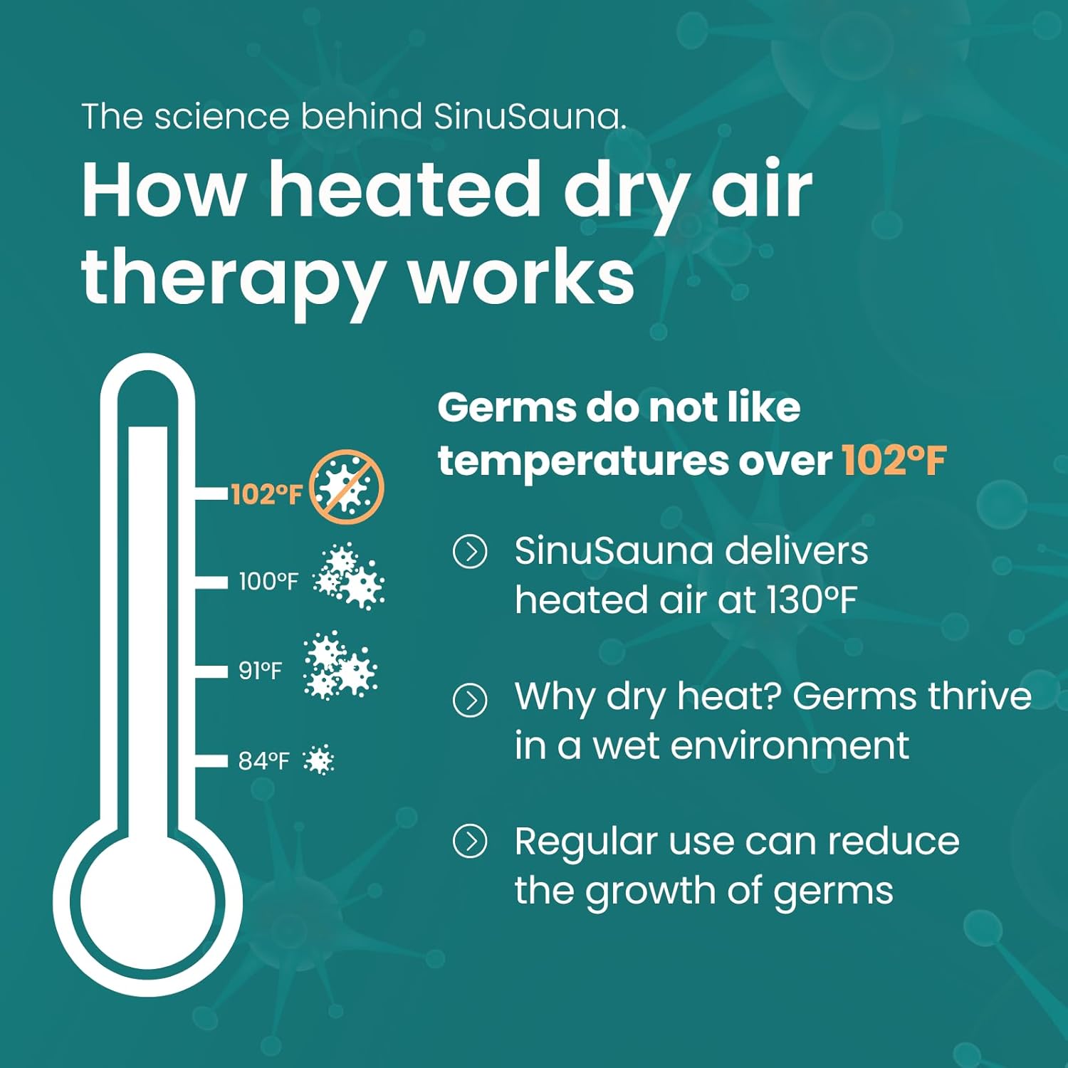 HOW IT WORKS: SinuSauna makes use of heated dry air remedy. Germs don’t like temperatures over 102°F and SinuSauna delivers 130°F warmth. Germs additionally thrive in moist environments and the dry warmth limits their progress. Common use can scale back the expansion and buildup of germs.