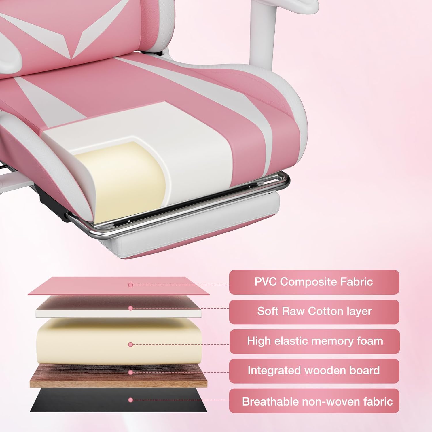 【Racing Type】90°-165° reclining backrest with imitation racing seat adjuster to make you’re feeling like racing. Further 5° rocking system brings you a leisure time extra enjoyable