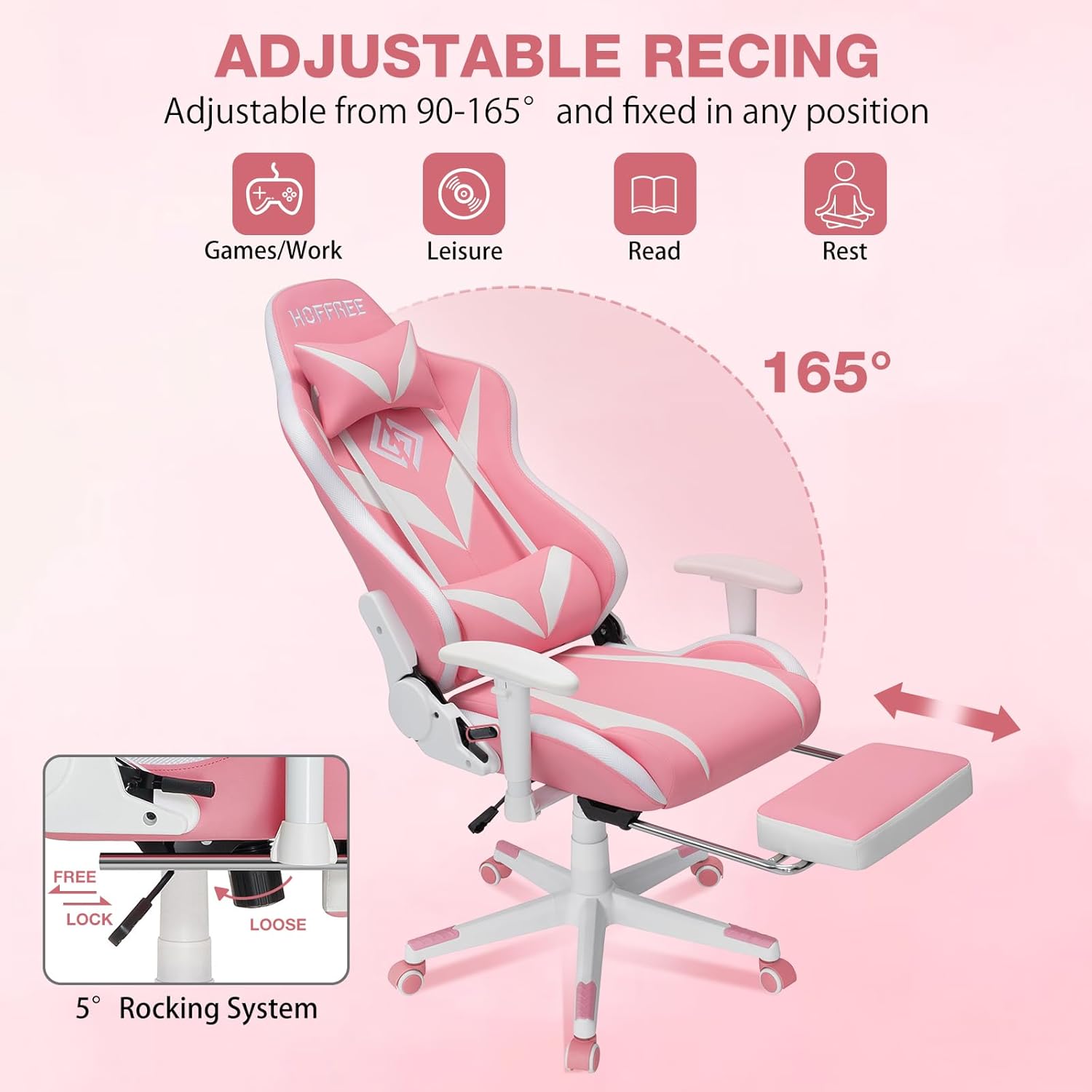 90°-165° reclining: Backrest might be all the way down to 165° and glued at any place to fulfill your wants.Racing type: Reclining system with imitation racing seat adjuster to make you’re feeling like racing.Rocking system: Further 5° rocking system brings you a leisure time extra enjoyable.