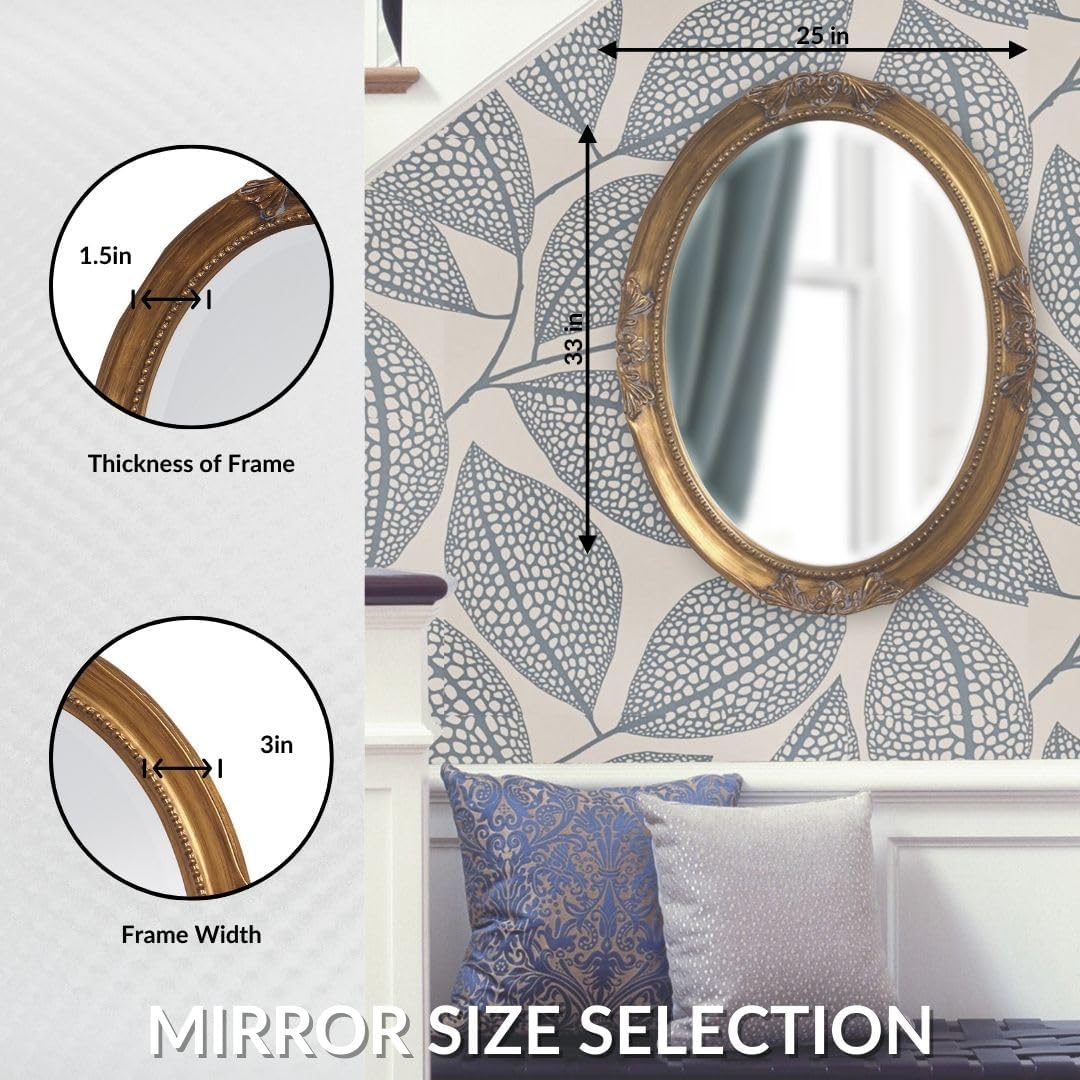 PRODUCT DIMENSIONS: This Oval Vintage Gold mirror measures about 33 x 25 inch in measurement that matches completely classic Spherical mirror for any model within the house or toilet décor.