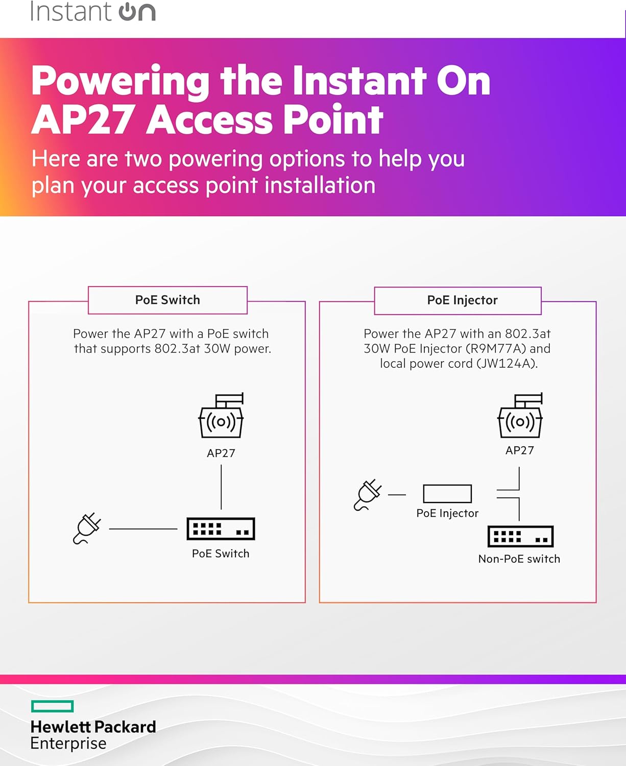 POWERING: The Immediate On AP27 might be powered with Energy over Ethernet (PoE) 802.3at Class 4 solely. This mannequin (S1T36A) offers solely the unit, no energy supply included. For powering, use both a 802.3at 30W PoE Injector (R9M77A) or a PoE swap that helps 802.3at 30W PoE energy. The Immediate On swap sequence can all energy this entry level