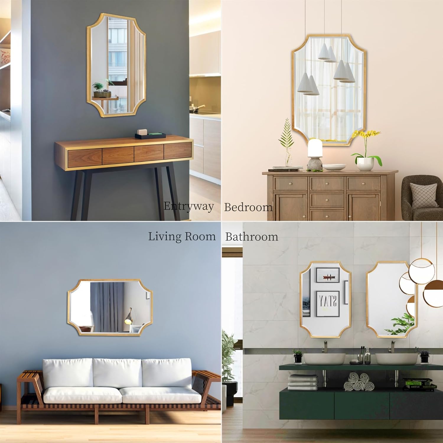 HIGH QUALITY: The mirror is comprised of a sturdy gold metallic body and a 1/6 inch thick clear mirror (True Reflection – No Distortion), and it has a 1 inch beveled edge. Mirror additionally has 3mm FSC-certified engineered wooden again for reinforcement. The mirror weighs 20lbs, however our up to date hanging hardwares could make it straightforward to hold on the wall. The standard of the mirror stands out from many different mirror merchandise.